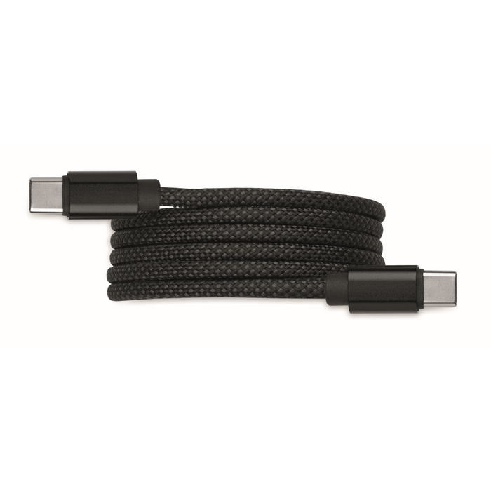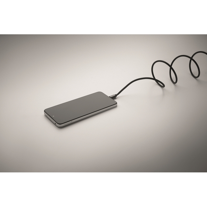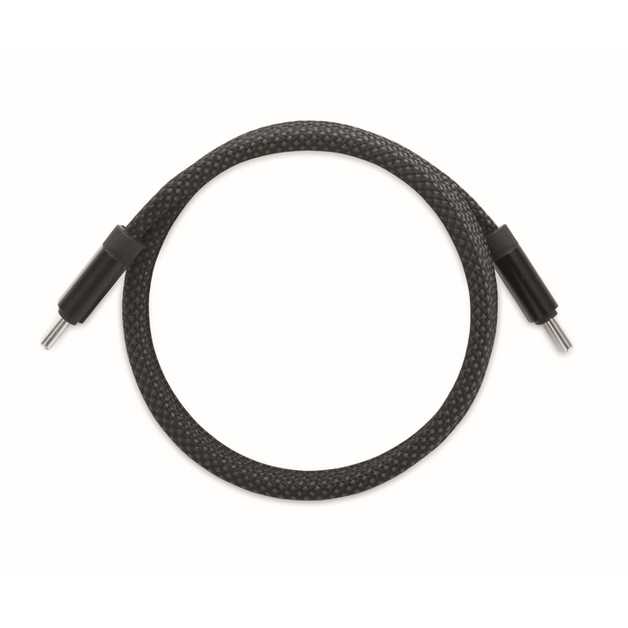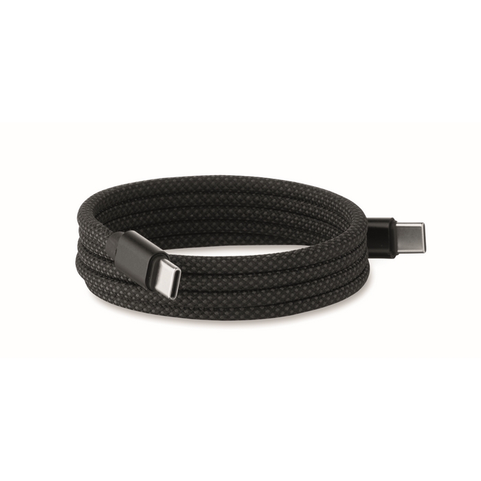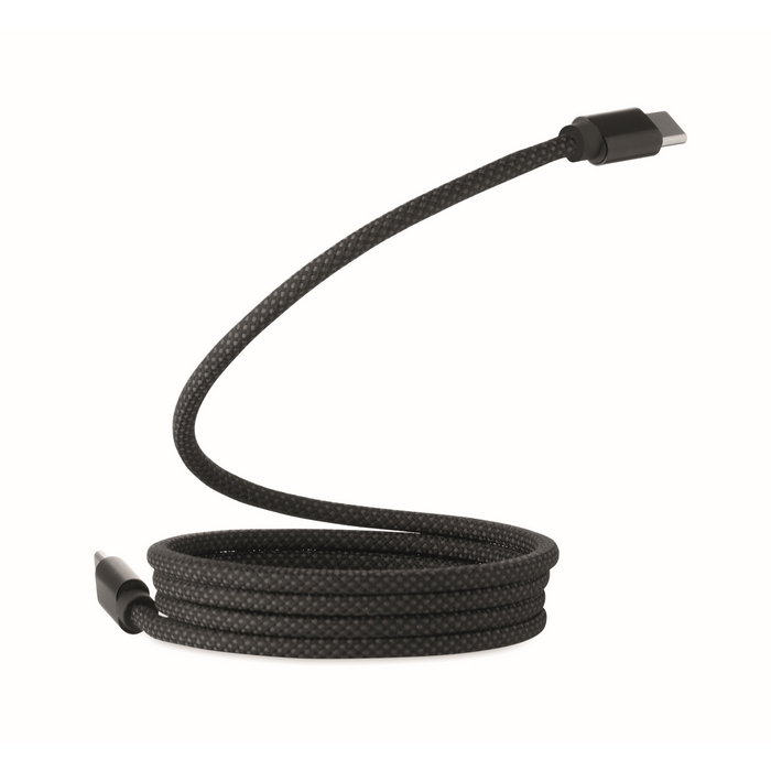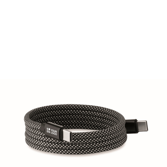 Cabo magnético trançado feito de rPET e alumínio, concebido para uso diário em locais de escritório. Com ligação Tipo-C a C, permite carga rápida até 60 W e dispõe de 1 m de comprimento para trabalhar com conforto na secretária, salas de reunião ou postos de trabalho flexíveis. A estrutura magnética ajuda a juntar de forma organizada e evita emaranhados, facilitando o armazenamento e transporte. Opção prática para kits de boas-vindas, eventos ou material corporativo.