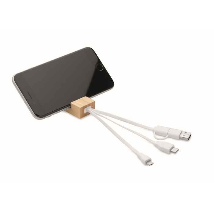 Cabo de carga retrátil multiUSB com detalhes em bambu e cabo de 90cm