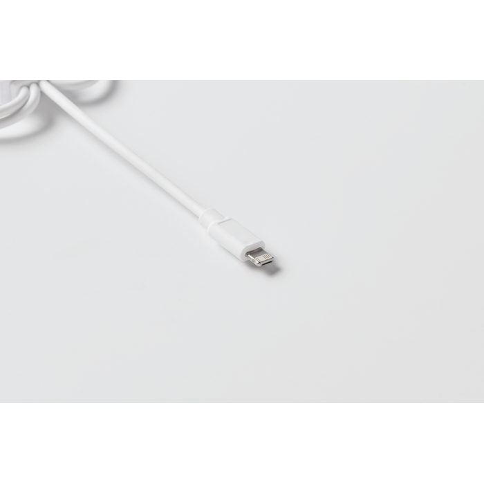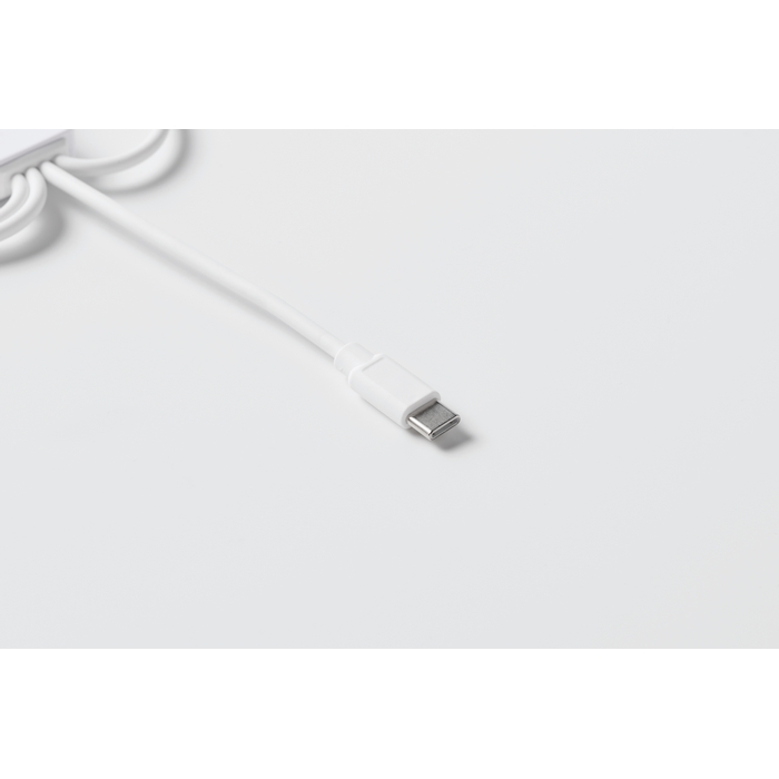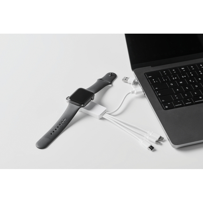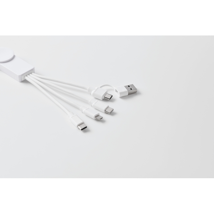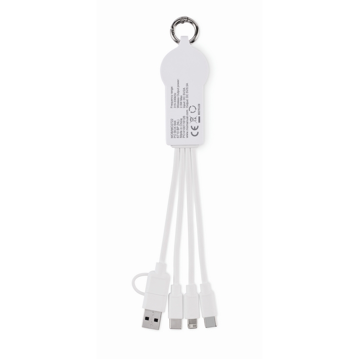 Porta-chaves com cabo de carga com entrada: 2 em 1 tipo-C e tipo-A. Saída: Carga de relógio (Samsung® e Apple®), 2 x tipo-C e micro-B (ficha 2 em 1). Cabo de TPE reciclado.