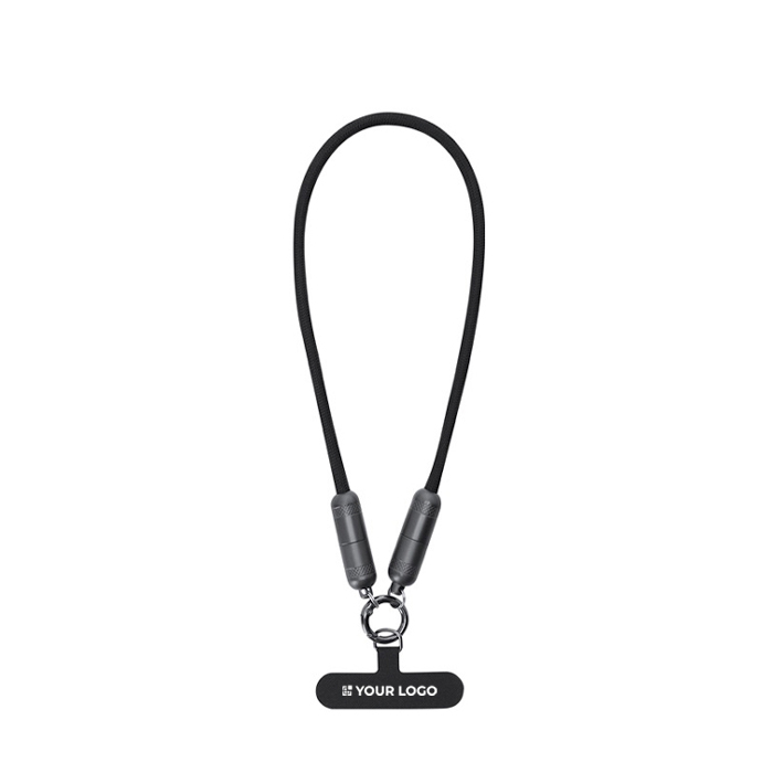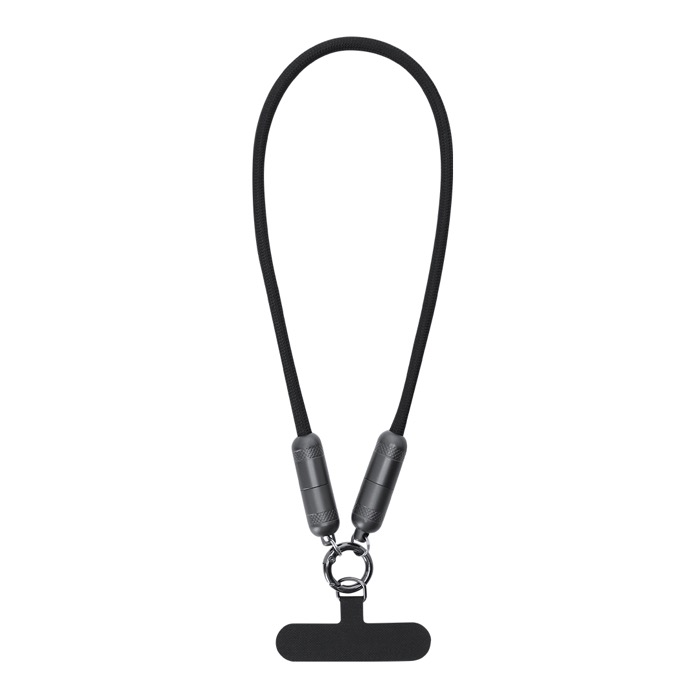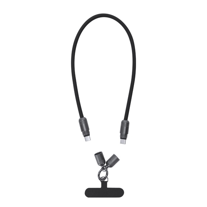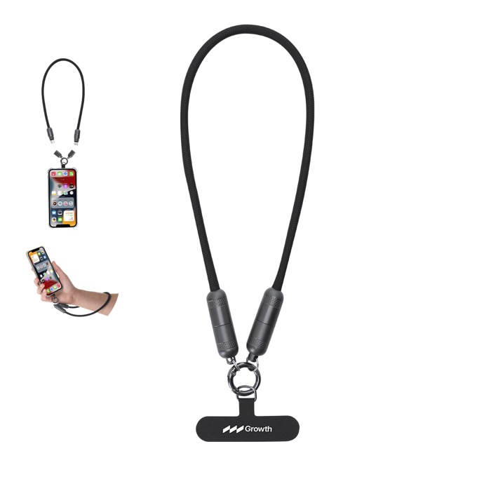 Pulseira e cabo de carga com função de transferência de dados e suporte para telemóvel. Com entrada/saída Tipo-C e capacidade de 60 W, o que permite carga rápida. Funcionalidade e conforto num só acessório.