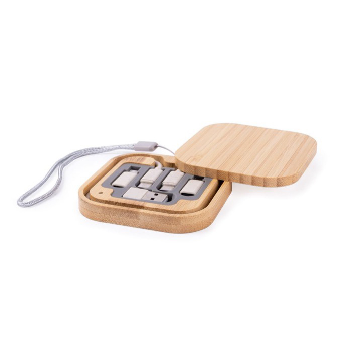 Conjunto de cabos 5 V e 2 A entregues numa elegante caixa de bambu com fecho magnético. Inclui ligações (USB, Tipo-C, Lightning e micro-USB).