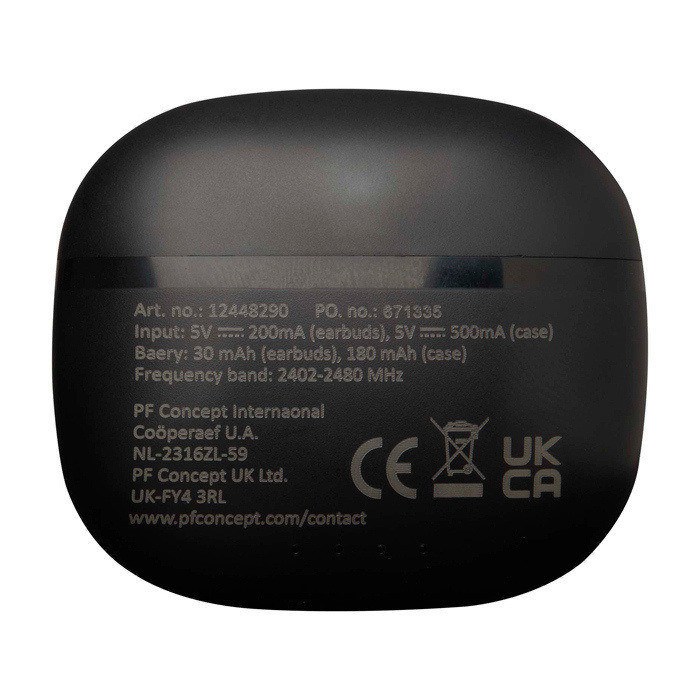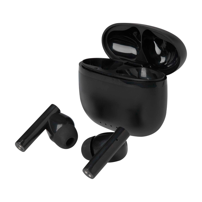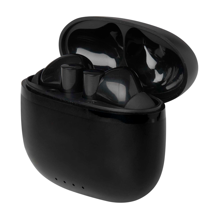 Auriculares TWS de plástico reciclado com ligação Bluetooth® pensados para chamadas e música sem cabos no dia a dia. Dispõem de almofadas de silicone que conseguem um ajuste confortável e estável. Guardam-se num estojo de carga compacto para os transportar facilmente. Oferecem até 4 horas de reprodução ou conversação e recarregam em cerca de 1 a 1,5 horas. Inclui cabo de carga de Tipo-A a Tipo-C de 30 cm. Úteis para ações de marca em eventos e brindes empresariais.