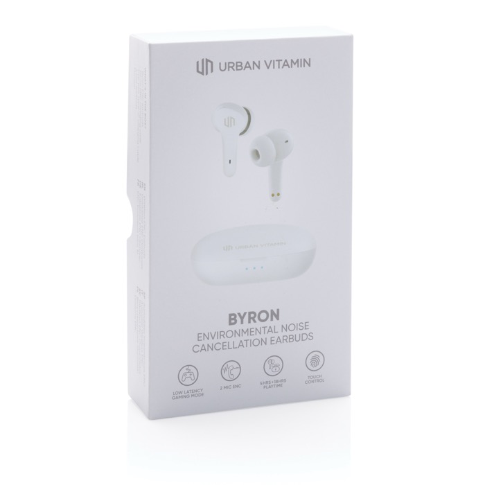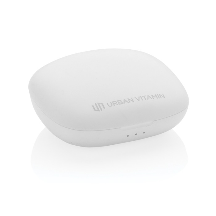 Aurciulares sem fio compacto, com um modo de jogo de baixa latência (65ms) para minimizar o atraso de som entre a tela e o áudio durante os jogos. Chamadas cristalinas graças ao cancelamento de ruído ambiental (ENC). Função de controle de toque. Fones de ouvido com até 5 horas de reprodução e o estojo de carregamento de bolso permitem até 18 horas de reprodução. Classificação IPX 4, resistente a intempéries e suor. Os itens Urban Vitamin são feitos sem PVC e apresentados em uma caixa com plástico reduzido.