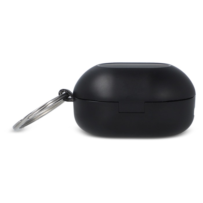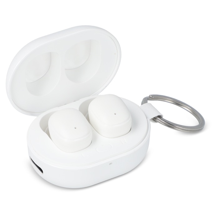 Auriculares pequenos em estojo do tamanho de um porta-chaves