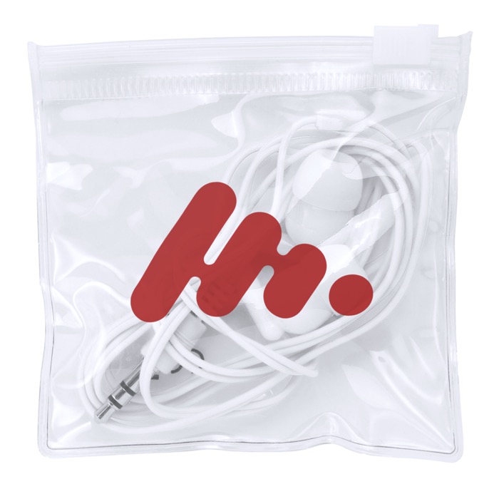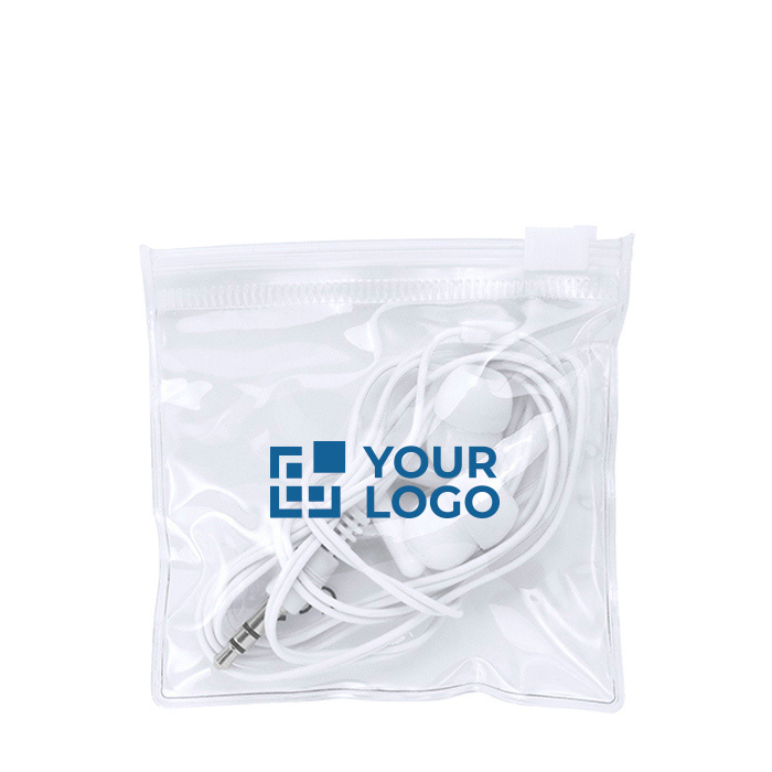 Aposte em incorporar brindes tecnológicos no seu merchandising com estes auriculares em estojo transparente de PVC e cabo com botão de segurança.