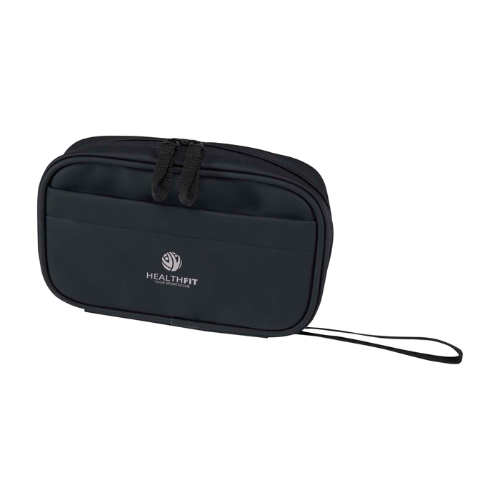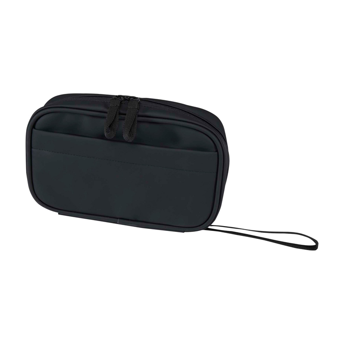 Bolsa organizadora tecnológica de pele sintética reciclada com forro de plástico reciclado a condizer, desenhada para manter acessórios bem ordenados durante viagens ou dias de trabalho híbrido. O compartimento principal com fecho de correr inclui porta-caneta elástico, dois bolsos de malha para auriculares e artigos pequenos, separador reforçado e várias correias elásticas para cabos, chaves de memória USB e carregadores. No exterior dispõe de bolso frontal com velcro e asa de correia. O revestimento resistente à água protege o conteúdo em deslocações e ações de marca.