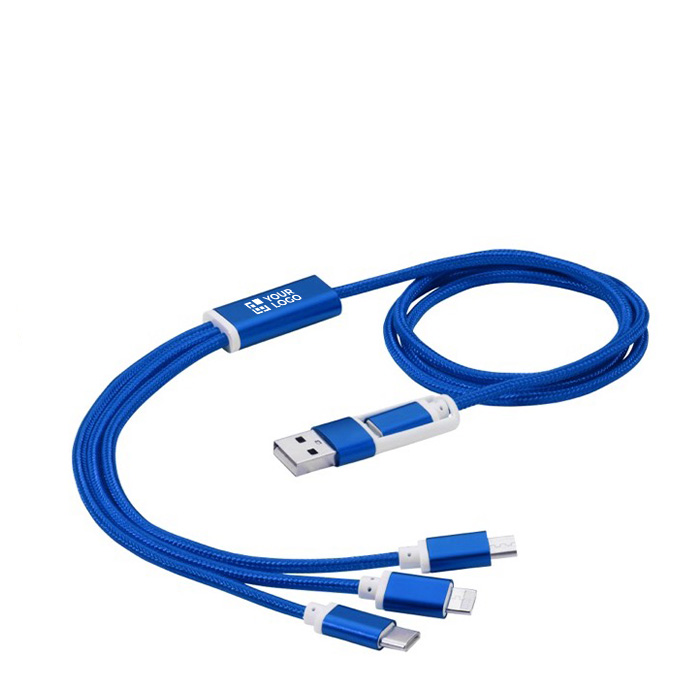 Cabo de carregamento de nylon trançado com 5 conectores diferentes: Entrada Tipo-C, entrada USB-A, saída Tipo-C, saída Apple® iOS e saída micro USB. Isto permite utilizar o cabo também com dispositivos de saída Tipo-C, que estão incluídos na geração mais recente de telefones e computadores MacBook. O comprimento do cabo é de 100 cm. Saída de ponta 2-em-1 até 2 A. Saída tipo-C até 3 A de corrente.