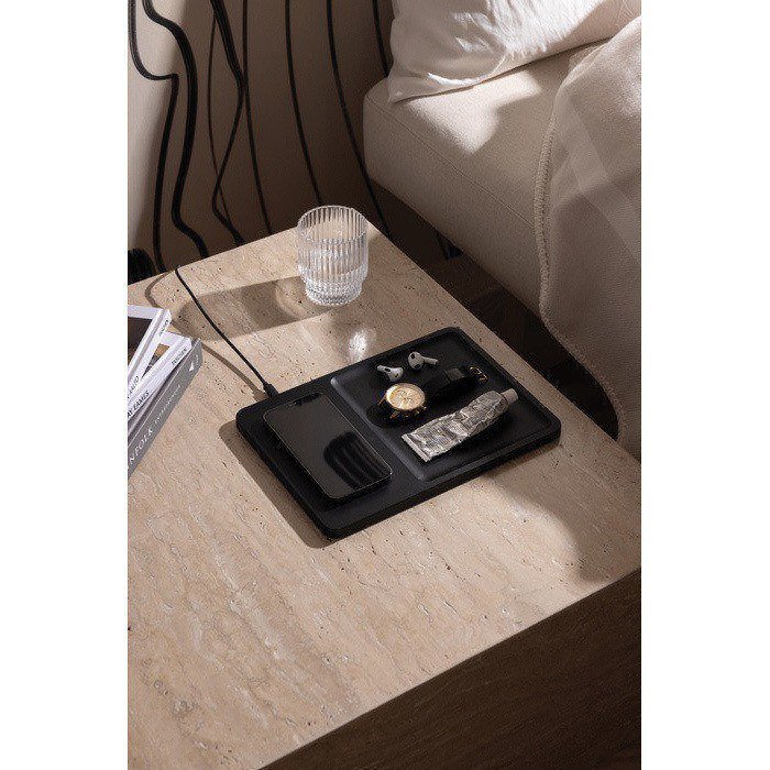 Carregador de secretária com tabuleiro multifuncional, prático e elegante para o lar ou escritório. Incorpora base de carregamento sem fios para telemóvel, que se activa ao ligar o tabuleiro com o cabo USB-C a USB-C de 1,2 m incluído. Além disso, oferece uma superfície útil para guardar objectos de uso diário como auscultadores, óculos ou chaves. Uma solução funcional para secretárias, entradas ou mesinhas de cabeceira. Fabricado com 47 % de ABS reciclado e 4 % de poliéster reciclado, certificado por RCS (Recycled Claim Standard), que garante a rastreabilidade dos materiais reciclados em toda a cadeia de fornecimento.