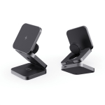 Carregador sem fios 3 em 1 fabricado em ABS reciclado RCS e alumínio reciclado RCS. Conteúdo reciclado total: 38%, com base no peso total do artigo. A certificação RCS garante uma cadeia de fornecimento totalmente certificada de materiais reciclados. Carregador sem fios magnético de 15W e um carregador sem fios adicional de 5W adequado para caixas de auscultadores ou outros pequenos dispositivos recarregáveis sem fios. Além disso, um carregador sem fios de 2,5W para smartwatches (apenas relógios Apple). Inclui cabo TPE reciclado de 120 cm certificado RCS. Apresentado em embalagem kraft mista FSC®. Artigo e acessórios 100% livres de PVC. Entrada: 9V/3A para uso ideal. Saída: Telefone: 9V/1.1A; 9V/1.67A/(15W), Auscultadores: 5V/1A (5W), Relógio: 5V/0.5A.