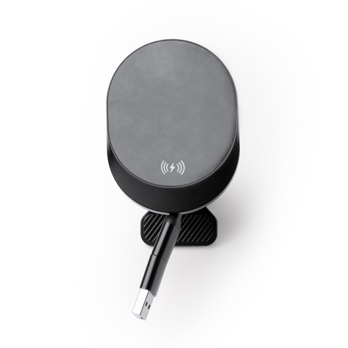 Carregador sem fios para carro para smartphone com saída até 15W, pensado para manter o telemóvel carregado enquanto conduz. Integra um cabo retrátil Tipo C com adaptador para USB, para que o possa ligar conforme a porta disponível e reduzir emaranhamentos. Inclui um anel magnético para melhorar o encaixe do dispositivo e um acessório para fixação na grelha de ventilação, facilitando o acesso ao ecrã. É entregue numa caixa de apresentação, útil para ações de marketing e entregas em eventos empresariais.