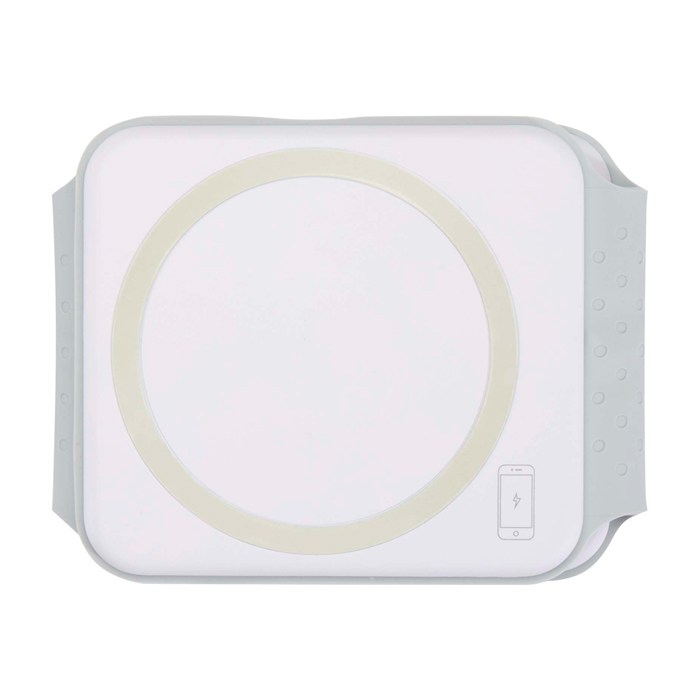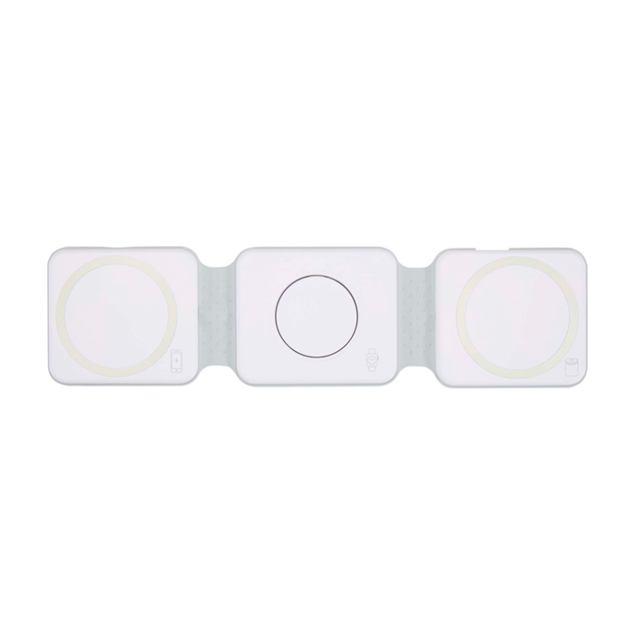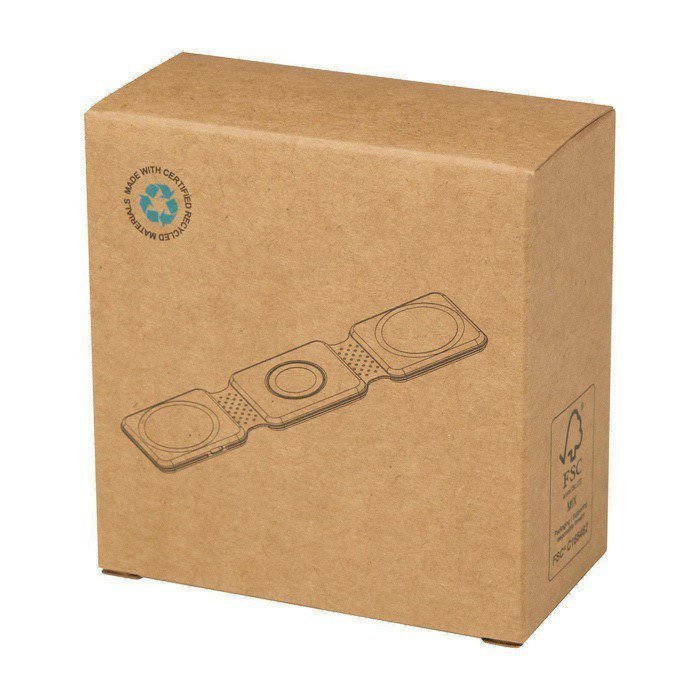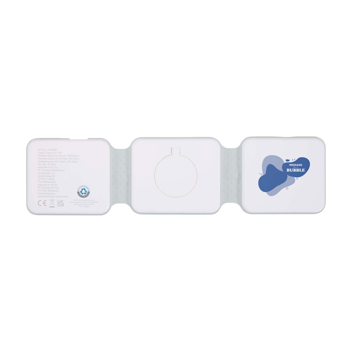 Carregador sem fios 3 em 1 de plástico reciclado, concebido para carregar ao mesmo tempo o smartphone, auriculares tipo AirPods e relógio tipo Apple Watch. Dispõe de carga sem fios até 15 W e estrutura dobrável com fecho magnético que facilita transportá-lo e manter o telemóvel estável durante o uso. Permite colocar o telemóvel em modo horizontal enquanto carrega, útil para videochamadas ou visualização de conteúdo. Compatível com telemóveis com carga sem fios, incluindo iPhone 12 e posteriores (ou telemóveis com anel magnético). Inclui conector Tipo-C (USB-C). Boa escolha para ações de marca em feiras ou como brinde para equipas comerciais.