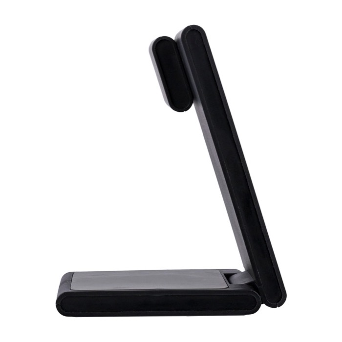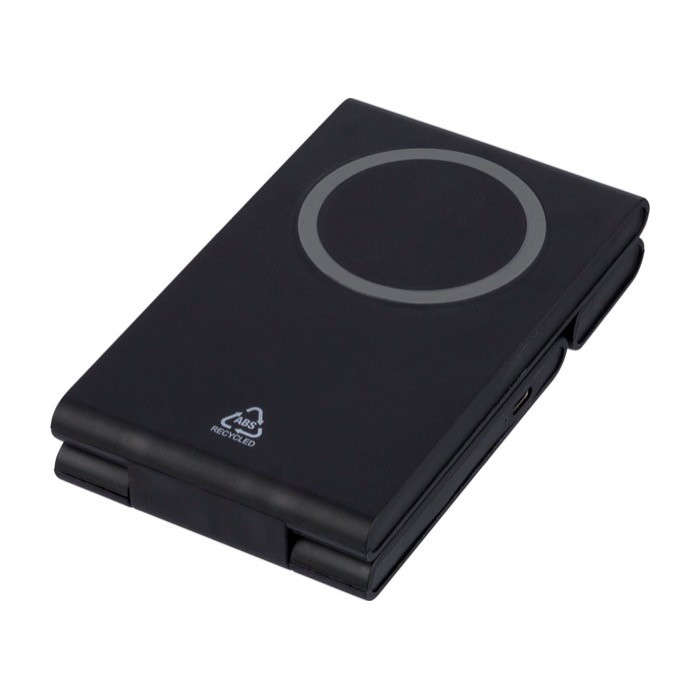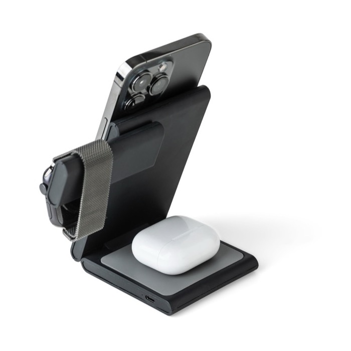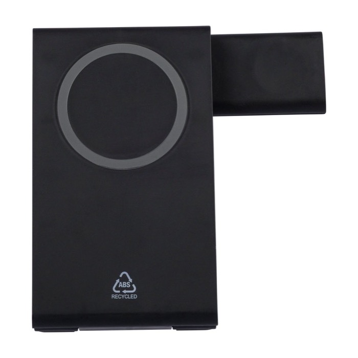 Estação de carga sem fios de plástico reciclado com sistema magnético 3 em 1 para smartphone, smartwatch e auriculares. Design ultraplano que ocupa pouco espaço e suporte dobrável para manter o telemóvel em posição de consulta enquanto carrega. Proporciona carga até 15 W para o telemóvel, 5 W para auriculares tipo AirPods e 2 W para Apple Watch, com entrada 5 V/3 A ou 9 V/3 A via Micro-B (Micro-USB). Entregue em caixa-oferta individual, útil para ações de recursos humanos ou eventos.