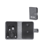 Base de carregamento completa feita de 300D rPET. Estojo compacto com fecho de botão e incluindo espaço de carregamento sem fios Qi para smartphones, auriculares e smartwatches. Fornecido com cabo de conexão Tipo C em ambas as extremidades, além de adaptadores USB e lightning/micro USB. O conjunto é completado por uma chave de extração de cartão SIM e um compartimento para armazenar um cartão Micro SIM. Com logótipo rPET. O material rPET é feito de plástico reciclado, promovendo assim a reutilização de resíduos plásticos e ajudando na sustentabilidade do planeta.