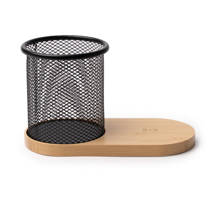 Porta-lápis metálico multifunções com design em grelha e base de bambu com carregamento sem fios integrado para dispositivos compatíveis. Permite-lhe manter a secretária organizada enquanto carrega o telemóvel sem cabos à vista. Oferece uma potência até 15W para um carregamento estável no dia a dia e inclui cabo de ligação Tipo C para o ligar facilmente ao seu equipamento ou adaptador. Uma opção prática para oferecer em eventos empresariais, onboarding ou como detalhe de escritório com o seu logótipo.