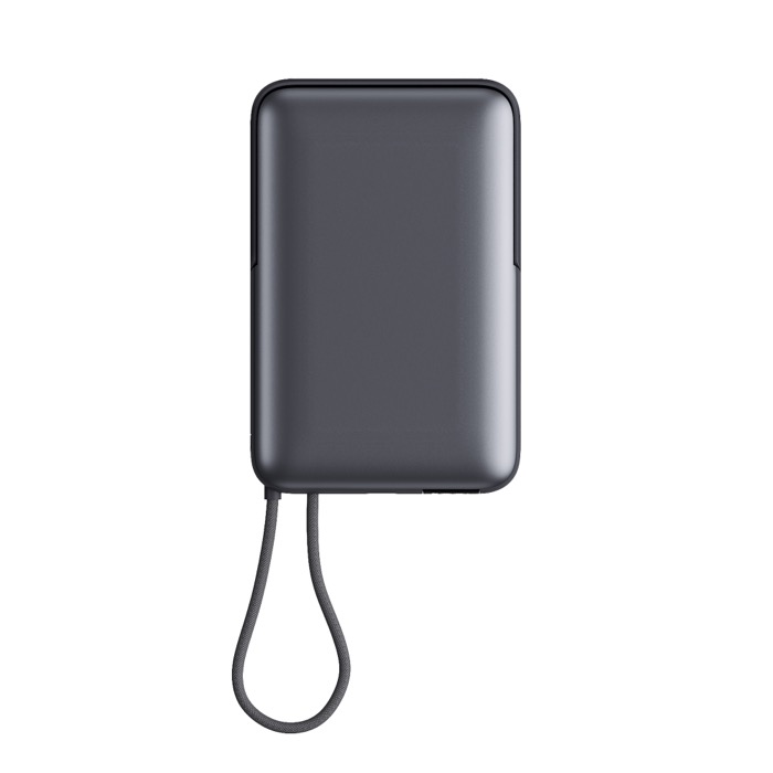Carregador portátil de plástico com carga rápida e ecrã LED para controlar o nível da bateria em tempo real. Permite carregar o telemóvel sem fios, com compatibilidade MagSafe e também alimentar outros dispositivos via ligação USB-C. A potência de 22 W reduz tempos de espera quando tem pressa, quer no escritório, como em deslocações. Solução prática para equipas comerciais, feiras e viagens de trabalho nas quais se precise de energia disponível durante o dia todo.