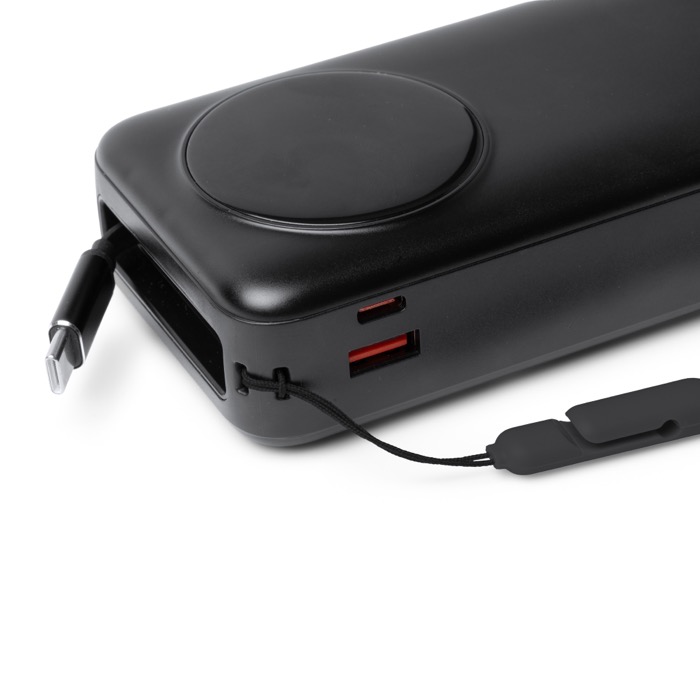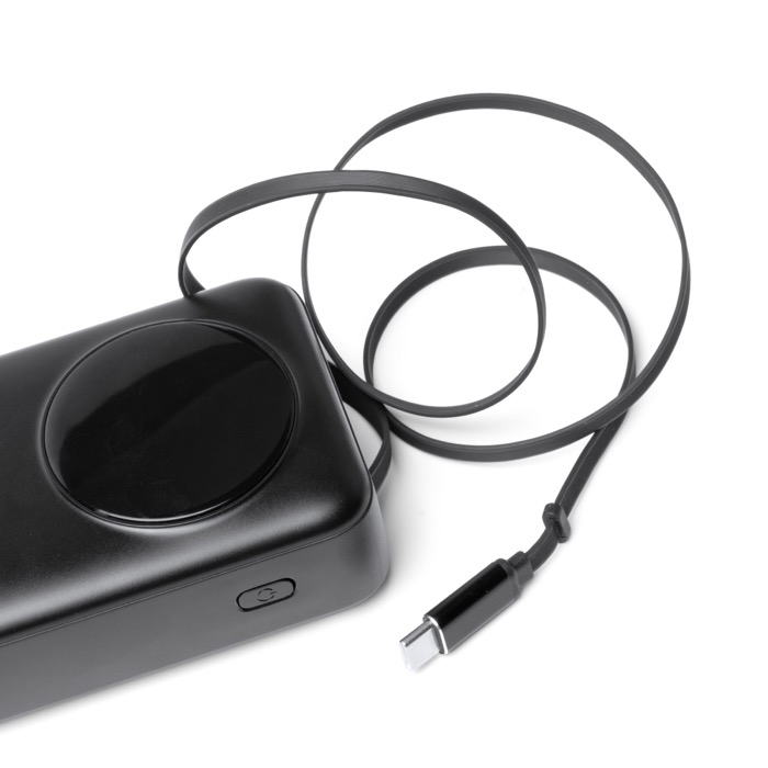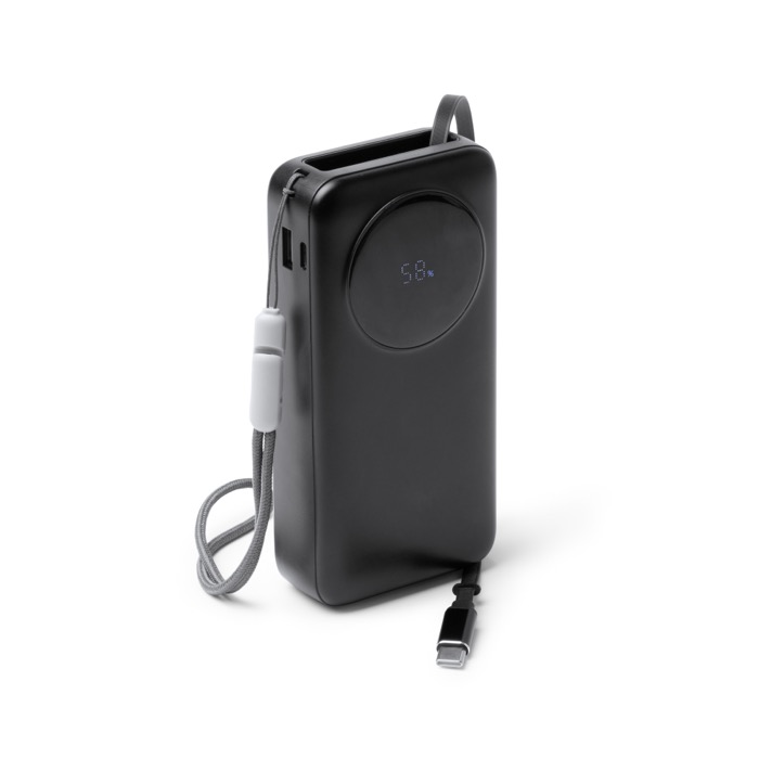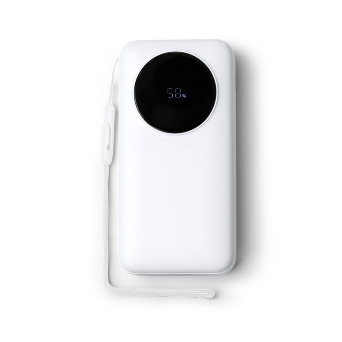 Power bank de plástico com grande capacidade de 20.000 mAh e potência máxima de saída de 22,5 W para carregar telemóveis e acessórios com rapidez. Integra um ecrã LED com a percentagem de carga, facilitando o controlo do nível de bateria durante a utilização. Inclui cabo Tipo C extensível a condizer com o corpo, além de uma porta Tipo C de entrada e saída e uma porta USB de saída para maior compatibilidade. Adiciona fita de transporte em tecido para a levar confortavelmente em eventos, formações ou deslocações da empresa.