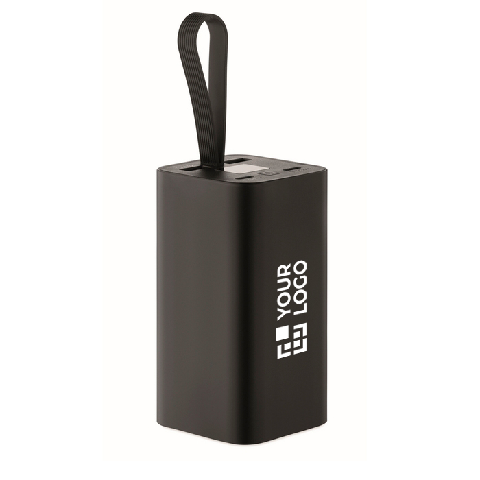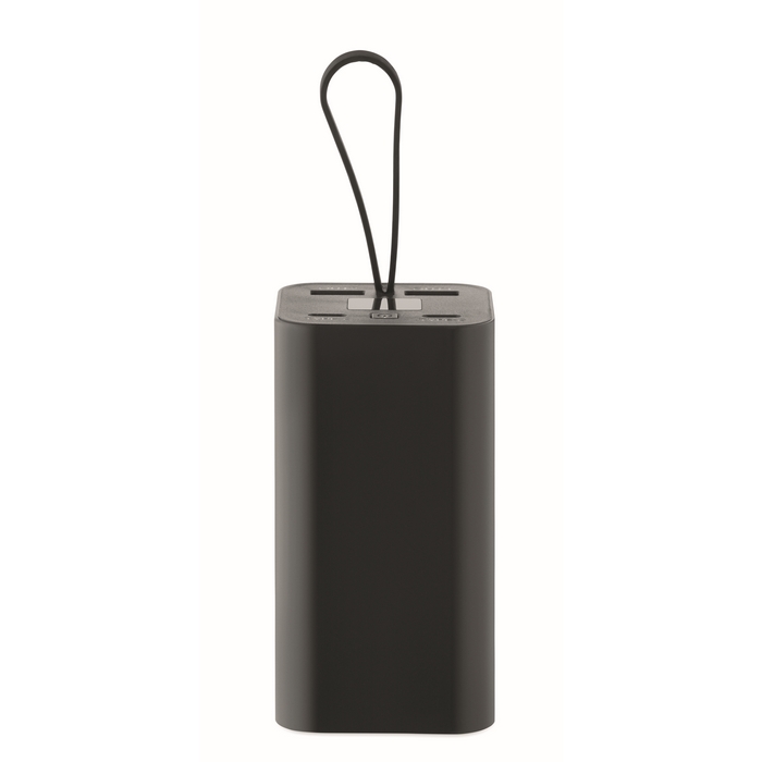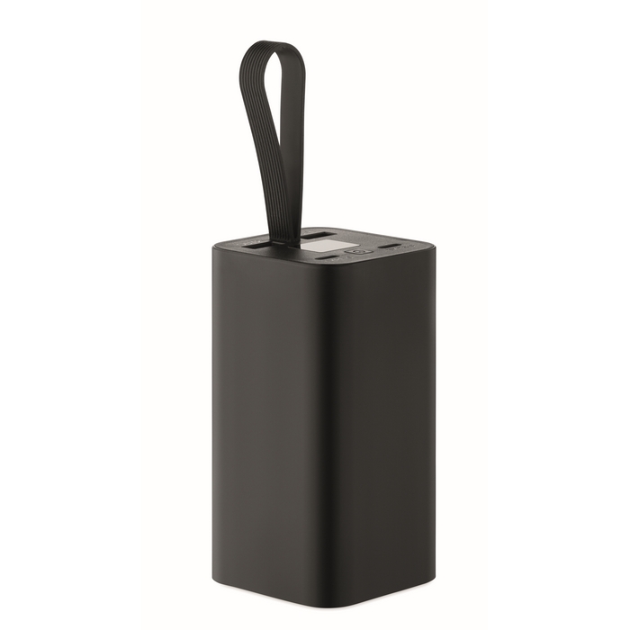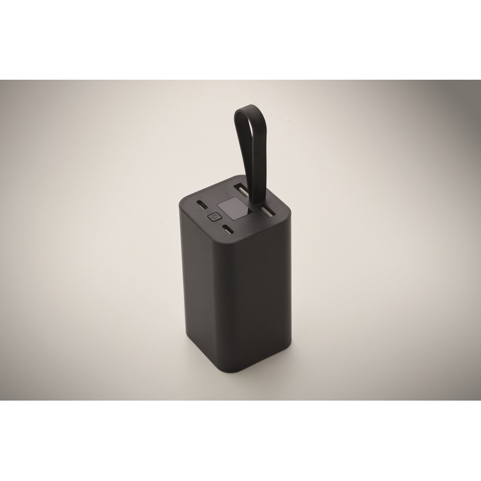 Powerbank de alumínio reciclado com ecrã digital para controlar o nível de carga com um mero olhar e gancho de silicone para o levar na mochila ou pendurar numa pasta. Inclui duas saídas USB-C e duas USB-A para carregar vários dispositivos de uma só vez. Dispõe de carga rápida PD de 65 W, útil para telemóveis, tablets e dispositivos compatíveis. Recomendado para kits de boas-vindas, eventos e equipas comerciais em movimento.