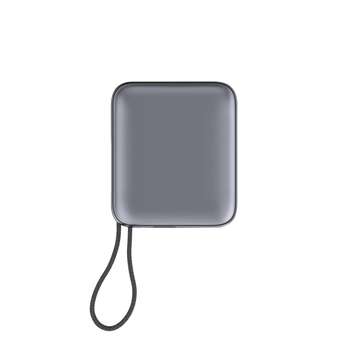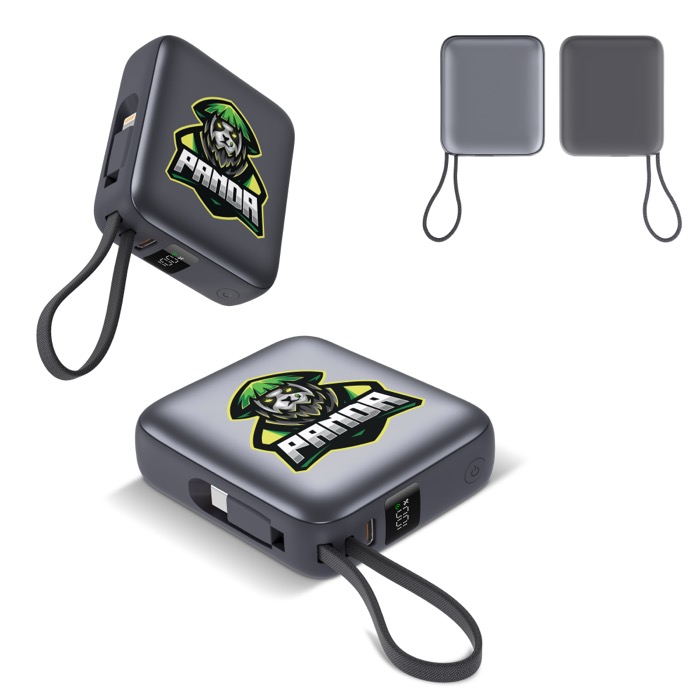 - Powerbank compacto com cabos integrados para carga direta
