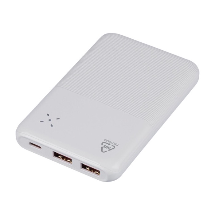 Powerbank de plástico reciclado com bateria de iões de lítio de 10 000 mAh e carga rápida de 22,5 W para dias de trabalho ou viagens intensos. Inclui entrada e saída USB-C (USB Tipo-C) e entrada USB-A (USB Tipo-A), o que facilita a compatibilidade com cabos comuns. O corpo combina uma zona lisa pensada para a marcação e relevo texturizado que melhora a preensão. Inclui ecrã digital superior para ver o nível de carga e sistemas de proteção contra sobreaquecimento, curto-circuito e sobrecarga. Entregue em caixa individual, útil para ações corporativas e eventos.