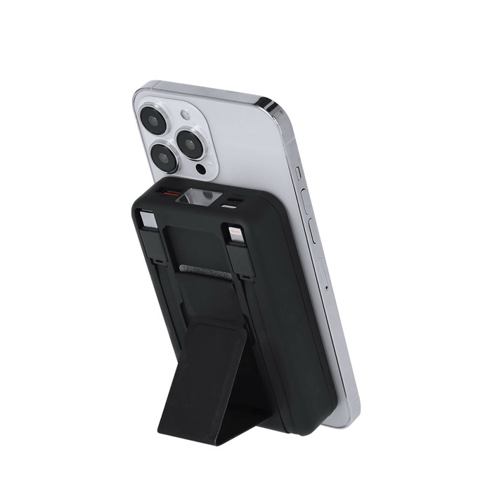 Powerbank de plástico reciclado com carga sem fios de 15 W e fixação magnética tipo MagSafe para manter o smartphone estável enquanto carrega. Inclui suporte para colocar o telemóvel na vertical e trabalhar ou seguir uma videochamada sem ocupar as mãos. Dispõe de saída USB-A e conectores Lightning e Micro-USB, além de entradas USB-C e Lightning para se adaptar a vários dispositivos e cabos. Escolha prática para ações de marca em feiras, eventos ou como brinde para equipas comerciais.