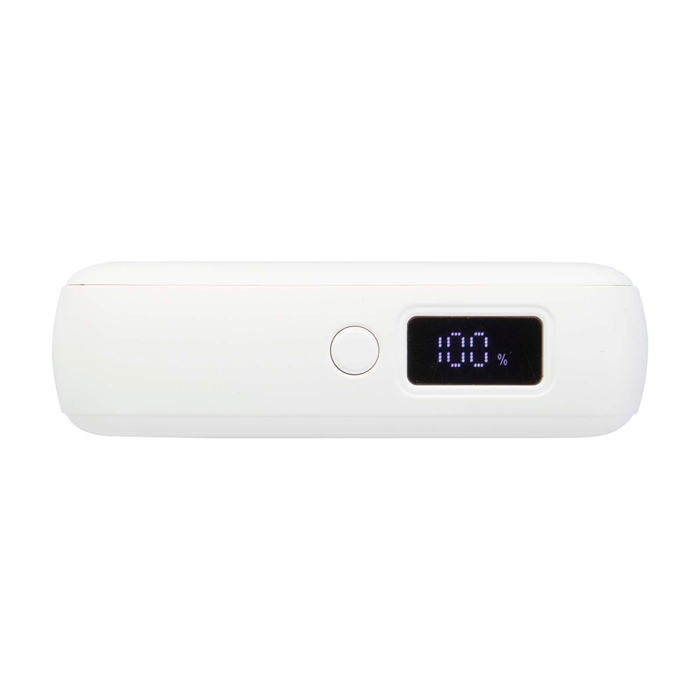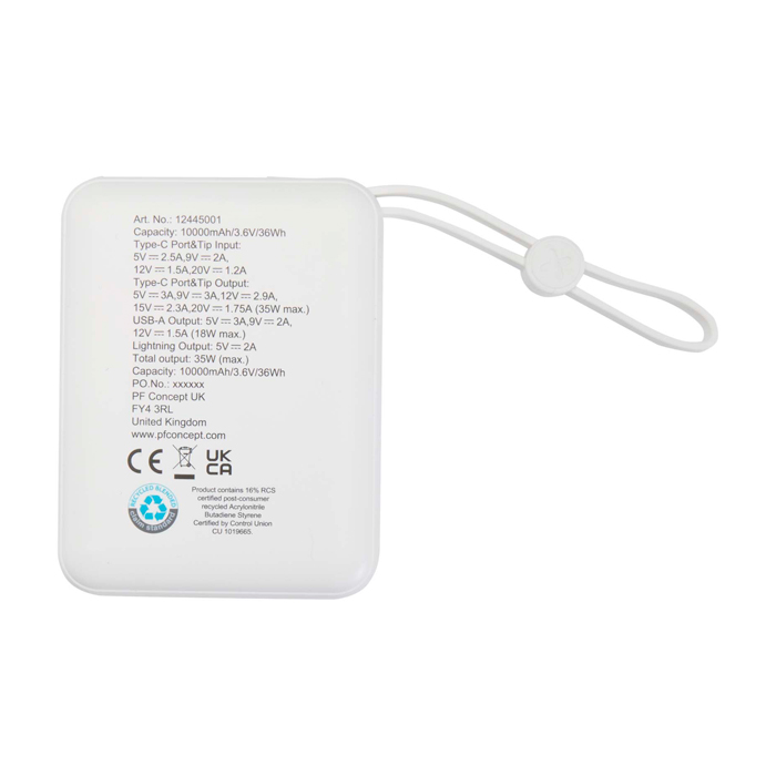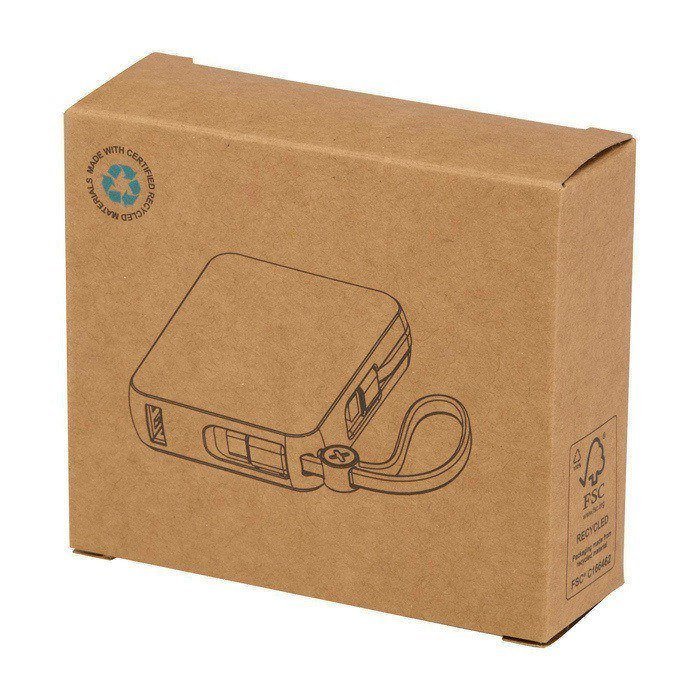 Powerbank de 10 000 mAh feito de plástico reciclado. Inclui uma entrada/saída USB-C de 35 W, porta USB-A de 18 W e cabo integrado USB-C e Lightning para carregar sem acessórios adicionais. O ecrã digital mostra o nível de carga. Ideal para manter smartphones e tablets ativos durante o dia todo.