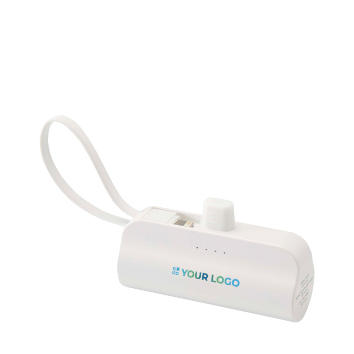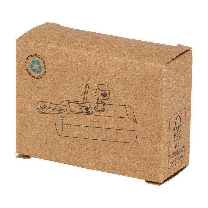 Powerbank feito de plástico reciclado, com ligação USB-C fixa, suporte para telemóvel dobrável integrado e cabo 2 em 1 incorporado (Lightning/micro-USB). Dispõe também de entrada/saída USB-C para maior flexibilidade, facilitando a carga do telemóvel em deslocações.