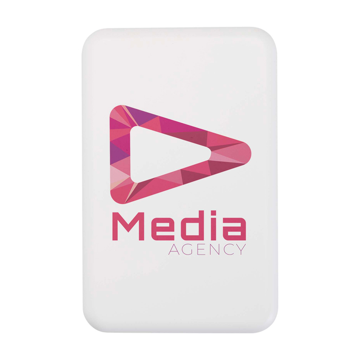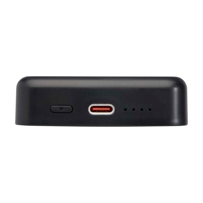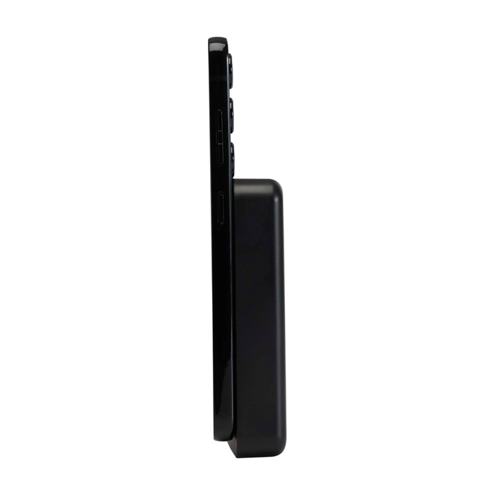 Powerbank compacto de 10 000 mAh, feito de plástico reciclado, com carga sem fios magnética até 15 W para smartphones compatíveis (incluindo iPhone 12 e posteriores) e adesivo com anel metálico para dispositivos sem íman. Permite carga rápida por cabo USB-C de 20 W e carregar dois dispositivos de cada vez (sem fios + cabo). Indicador LED do estado de carga/bateria.