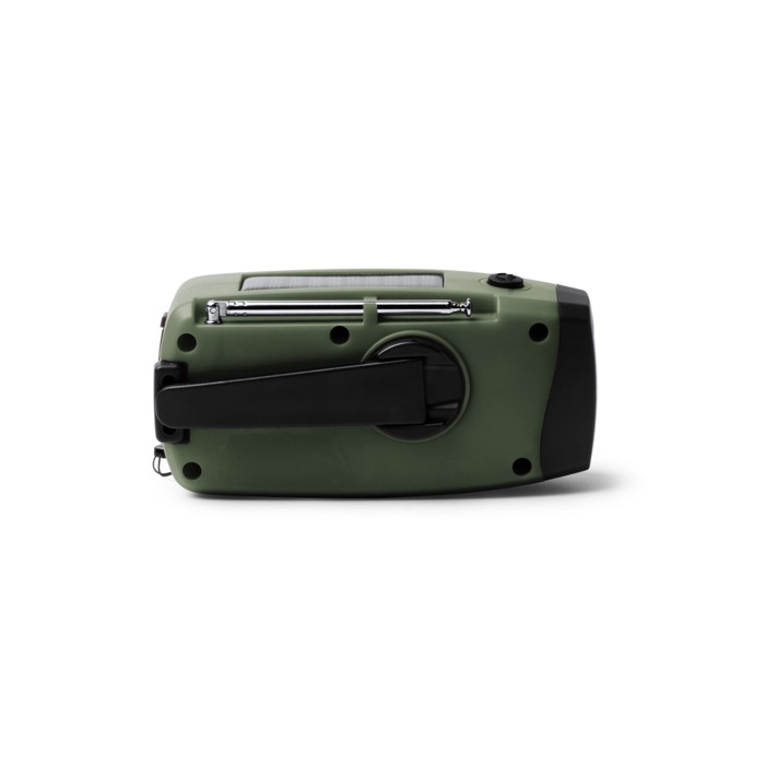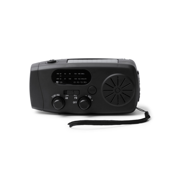Rádio de emergência multifunções em plástico com sistema de carregamento por dínamo e apoio de painel solar para manter o equipamento operacional quando não há acesso a eletricidade. Integra lanterna LED e sirene SOS para sinalização em situações adversas, além de antena para melhorar a receção. Incorpora altifalante de 2W e powerbank de 2.000mAh para recarregar dispositivos, com porta de entrada USB e saída USB-C. Opção prática para equipar equipas, pessoal técnico ou eventos com um recurso de apoio.