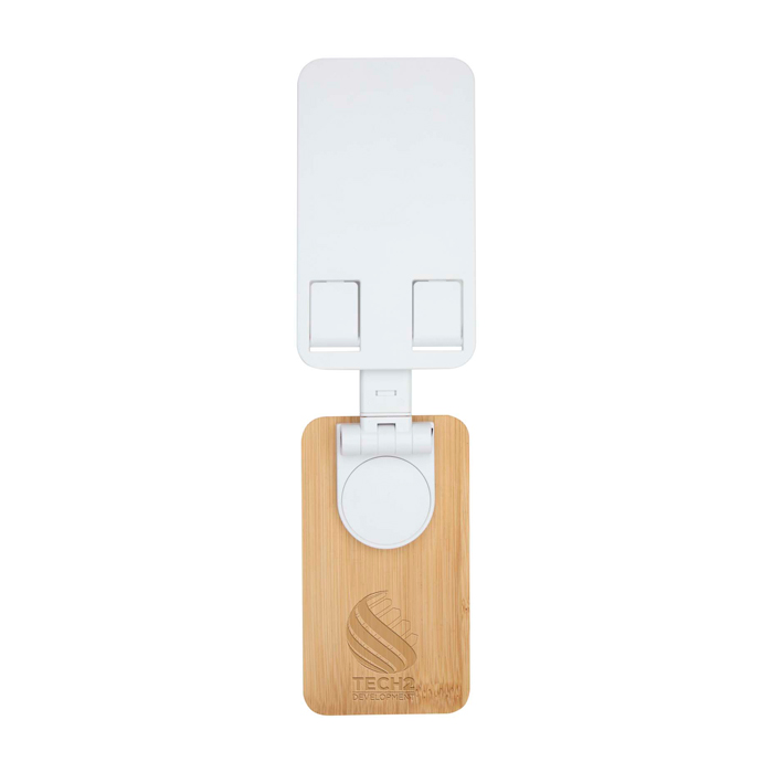 Suporte para telemóvel feito de plástico reciclado e bambu de origem responsável, com altura e ângulo ajustáveis para adaptar a visualização de forma prática. Adequado para secretária ou espaço de trabalho, já que posiciona o dispositivo de forma estável.