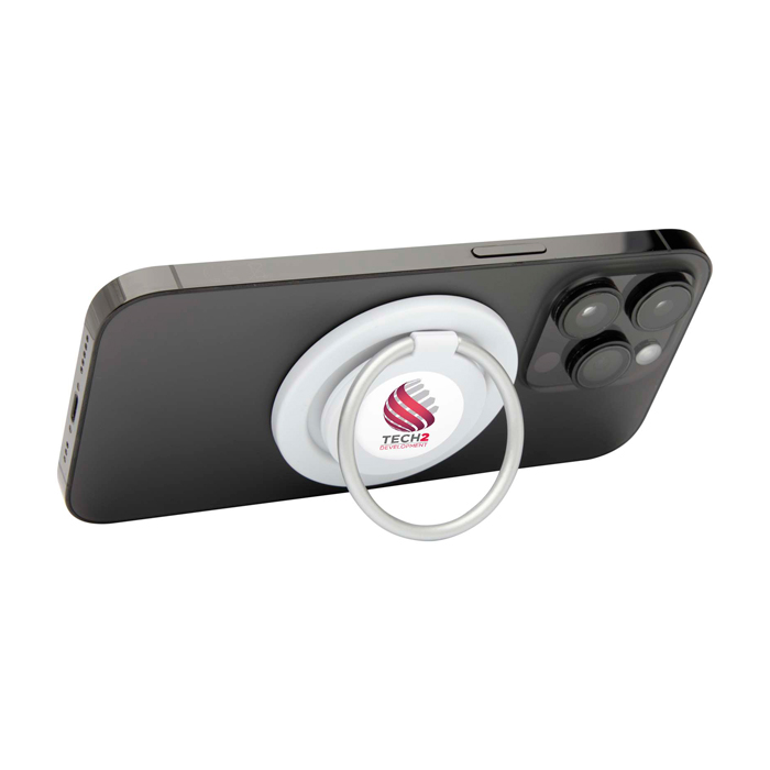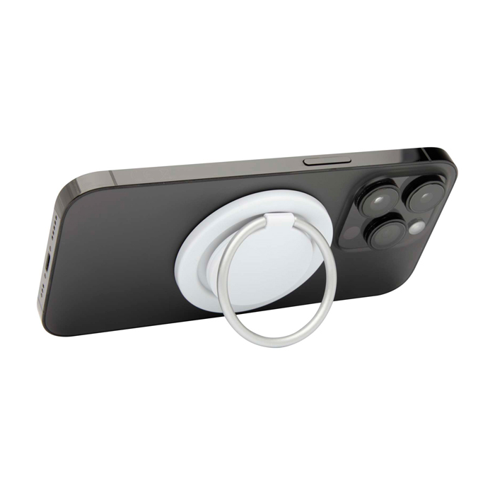 Acessório para telemóvel feito de plástico reciclado, desenhado para iPhone 12 e posteriores, com fixação magnética forte e anel integrado que funciona como pega segura ou como suporte para visualização mãos-livres. Dá mais estabilidade e segurança no uso diário.