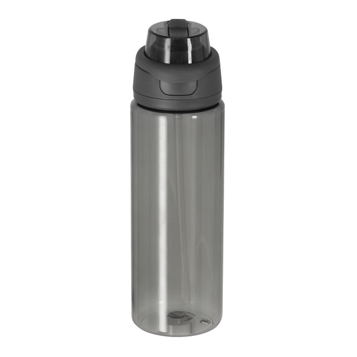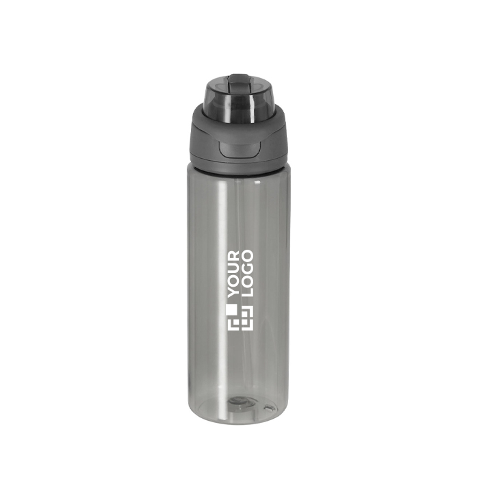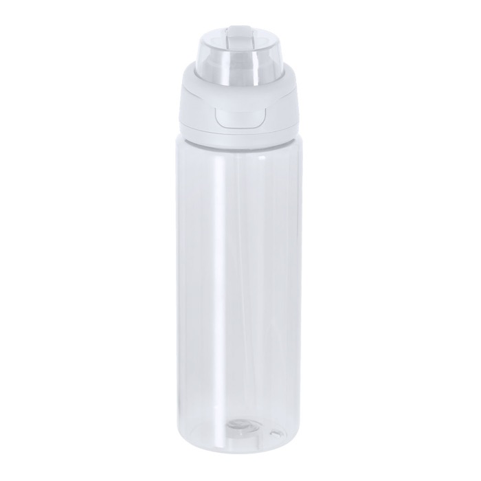 Garrafa de plástico reciclado com acabamento translúcido e capacidade de 750 ml, concebida para uso diário no escritório e deslocações. Inclui sistema de bebida duplo: palhinha para goles cómodos e orifício direto para beber rapidamente. A tampa com fecho de pressão evita aberturas acidentais e a pega dobrável facilita o transporte ou fixação a mochilas. Feita sem BPA (bisfenol A) para utilização mais segura. Escolha prática para ações de RH, feiras ou campanhas com logo.