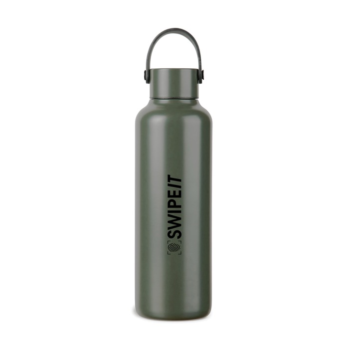 Garrafa com isolamento a vácuo de parede dupla fabricada com aço inoxidável reciclado certificado RCS. O seu design incorpora uma asa minimalista de PU e detalhes em preto que acrescentam um estilo moderno. O isolamento mantém as bebidas frias até 12 horas e quentes até 6 horas, ideal tanto para viagens como para o dia-a-dia. Fabricada com 80 % de aço inoxidável reciclado e certificada por RCS (Recycled Claim Standard), que garante a rastreabilidade dos materiais reciclados em toda a cadeia de fornecimento. Não apta para máquina de lavar loiça nem micro-ondas; recomenda-se lavagem à mão.