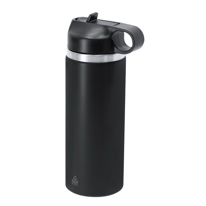 Garrafa de aço inoxidável para empresa e publicidade feita de material reciclado e conta com um prático bocal para beber de forma fácil e cómoda.