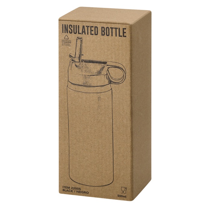 Garrafa de 500 ml fabricada em Aço Inoxidável Reciclado de parede dupla, que garante uma melhor e mais duradoura conservação da temperatura. Sistema de fácil abertura com doseador de palhinha (livre de BPA) e pega de transporte a condizer.