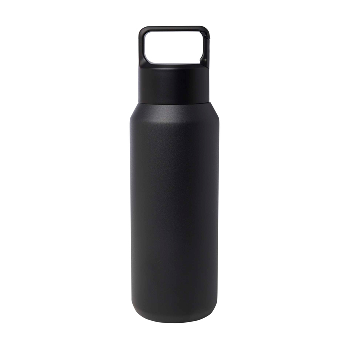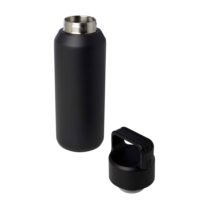 Garrafa com isolamento a vácuo de cobre e parede dupla, feita de aço inoxidável com certificação RCS. Dispõe de tampa com mosquetão incorporado para a fixar a mochila ou cinto. Também é adequada para refrigerantes. Entregue em caixa-oferta de cartão reciclado. Capacidade: 600 ml.