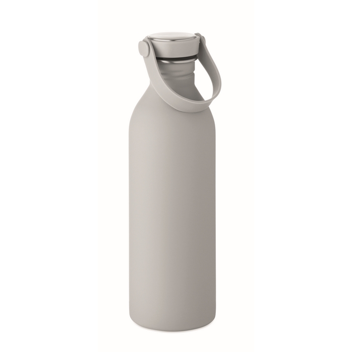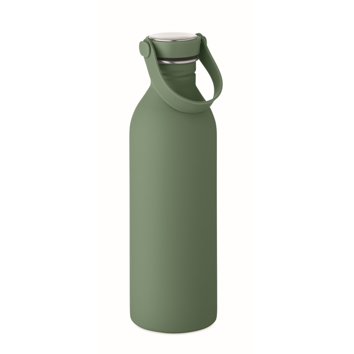 Garrafa de parede simples de aço inoxidável, 90% feita de aço inoxidável reciclado e 10% aço inoxidável, com acabamento de borracha para uma preensão mais segura. Inclui tampa de PP e aço inoxidável com pega de silicone para facilitar o transporte no dia a dia. Capacidade de 500 ml, pensada para água e bebidas frias no escritório, eventos ou deslocações. Escolha prática para incluir em packs de boas-vindas, ações de fidelização ou merchandising corporativo.