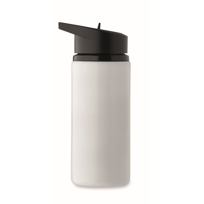Garrafa de aço inoxidável reciclado (90% de aço inoxidável reciclado e 10% de aço inoxidável) de parede única com bocal rebatível na tampa, palhinha e pega de transporte. Capacidade: 500 ml.