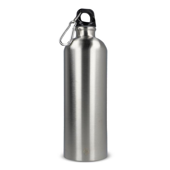 Uma garrafa duradoura de parede única feita de aço inoxidável reciclado, com um mosquetão para facilitar a sua fixação a sacos ou bagagem. A garrafa é leve, reutilizável e ideal para se manter hidratado em movimento. Disponível em várias cores brilhantes e metalizadas. Entregue em caixa-oferta.