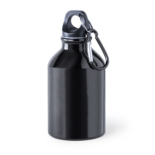 Garrafa promocional com capacidade para 330ml, cujo corpo é feito em alumínio. Este modelo encontra-se disponível em várias cores vivas e conta com uma tampa de segurança de rosca e mosquetão de metal que facilita o seu transporte. A garrafa é apresentada numa caixa de design atraente.