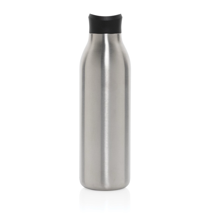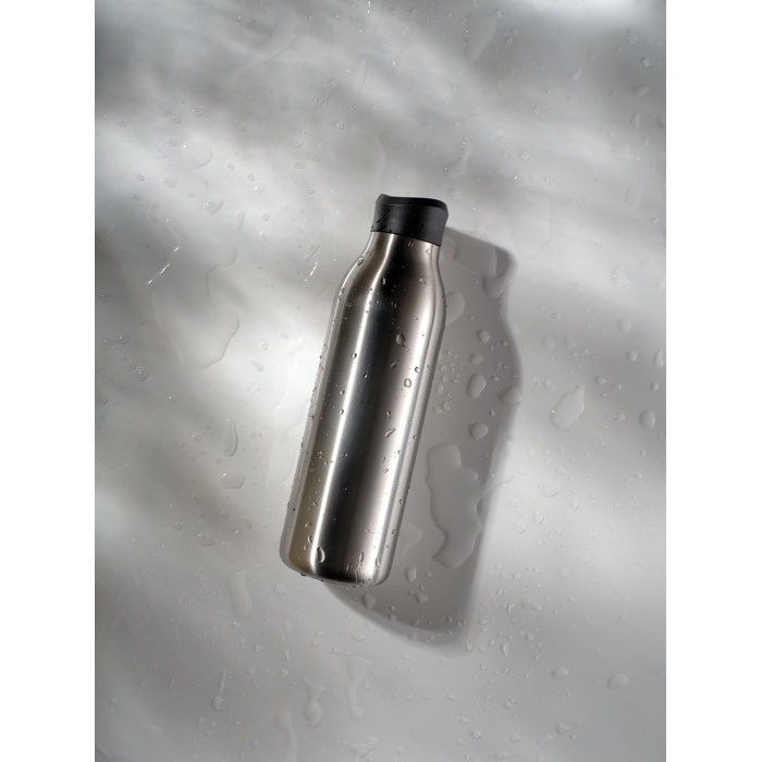Garrafa de 600 ml fabricada em aço reciclado com certificação RCS (77 % de conteúdo reciclado sobre o peso total do artigo), livre de BPA. Desenhada para oferecer uma experiência de bebida de 360° sem interrupções, conta com abertura fácil com uma só mão e tampa de limpeza simples. Apresenta-se em caixa kraft com certificação FSC®, reutilizável como suporte para telefone, porta-lápis ou vaso.