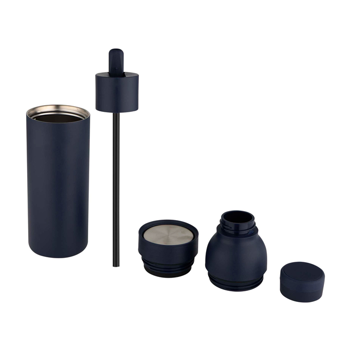 Garrafa de aço inoxidável de parede dupla com isolamento e revestimento interior de cobre, pensada para manter a temperatura das bebidas durante mais tempo. Proporciona rendimento térmico real no dia a dia: até 48 h frio e 12 h quente. Inclui 3 tampas interpermutáveis para se adaptar a vários usos: uma com pega de silicone para transporte, outra desportiva com bocal rebatível e palhinha, e a terceira com abertura superior com botão para manuseamento com uma só mão. Entregue em caixa-oferta, adequada para campanhas corporativas e eventos.