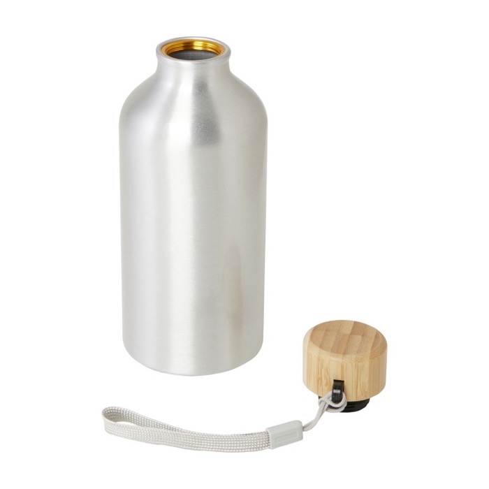Garrafa de 400 ml de capacidade. Fabricada em alumínio reciclado, com possibilidades de reciclagem quase infinitas, sem perder as suas propriedades originais e consumindo menos energia nesse processo. De acabamento mate, com tampa de rosca em preto, argola e mosquetão de transporte. Livre de BPA e apresentada em caixa individual de design kraft.