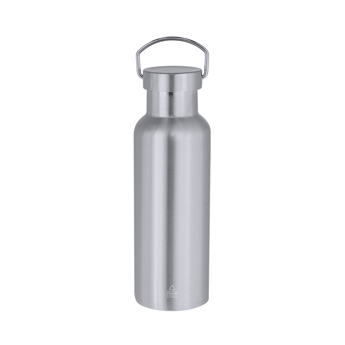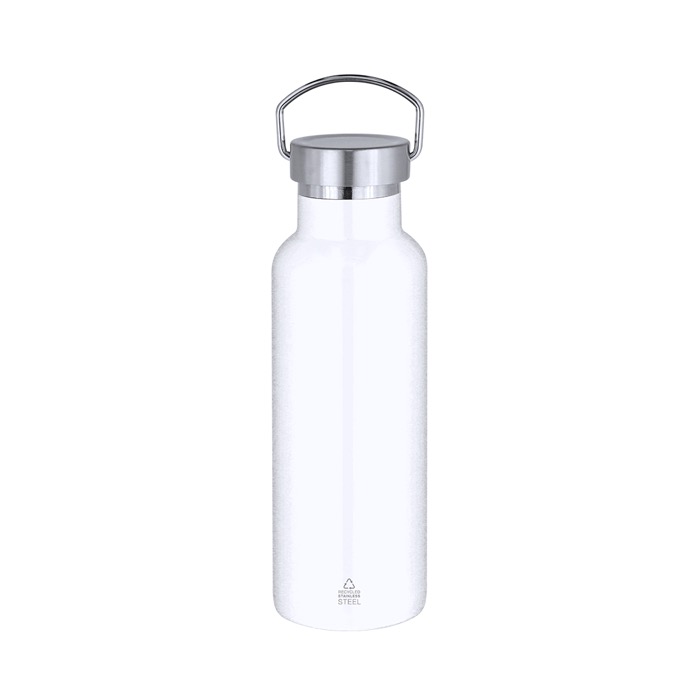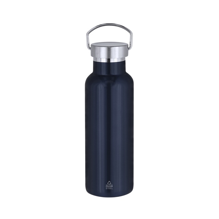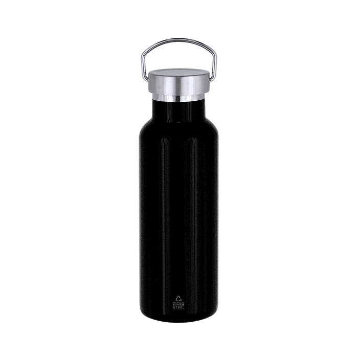 Garrafa térmica feita de aço inoxidável reciclado de parede dupla e 500 ml de capacidade. Acabamento em cores vivas com efeito metalizado. Tampa de rosca equipada com pega. Inclui selo de aço inoxidável reciclado.
