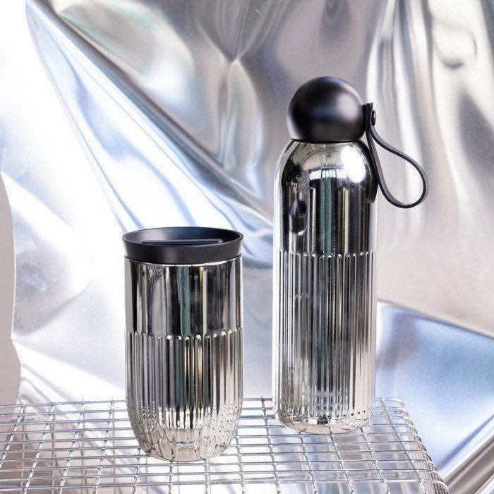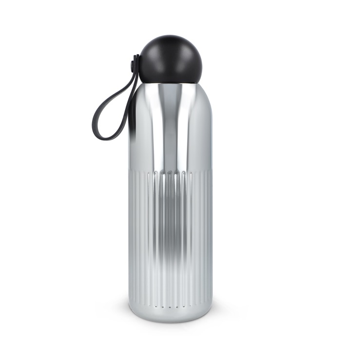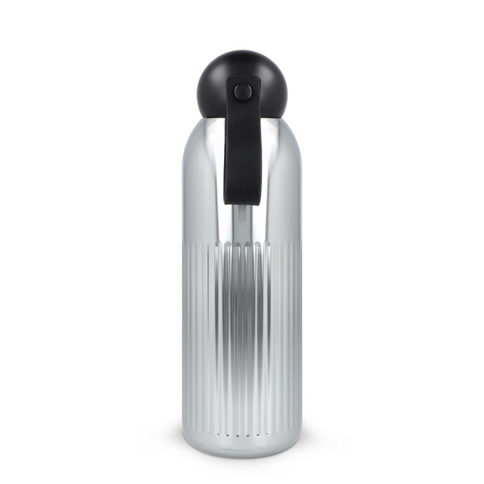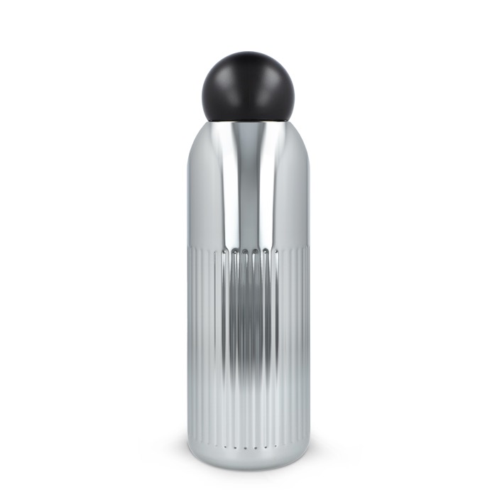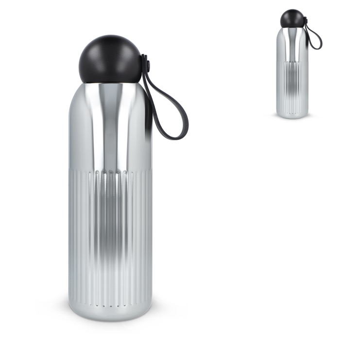 Garrafa de aço reciclado galvanizado com acabamento cromado e design de riscas verticais, concebida para uso diário no escritório ou deslocações. O isolamento a vácuo com revestimento de cobre mantém a bebida quente até 12 h ou fria 24 h sem condensação exterior. Dispõe de tampa redonda de plástico reciclado e palhinha amovível para beber confortavelmente. O fecho antigotas reduz derrames na mochila ou pasta. Adequada para lava-louça. Boa opção para merchandising corporativo com logo em eventos.