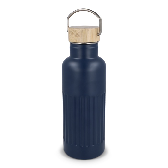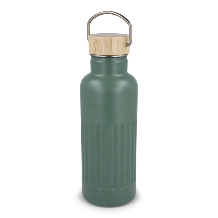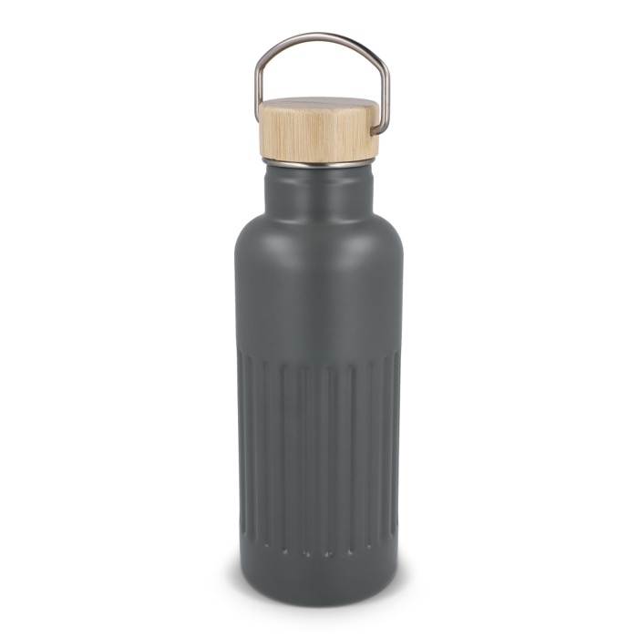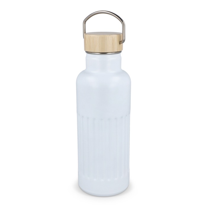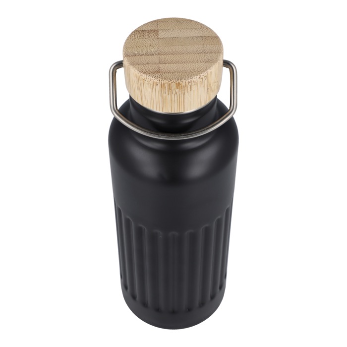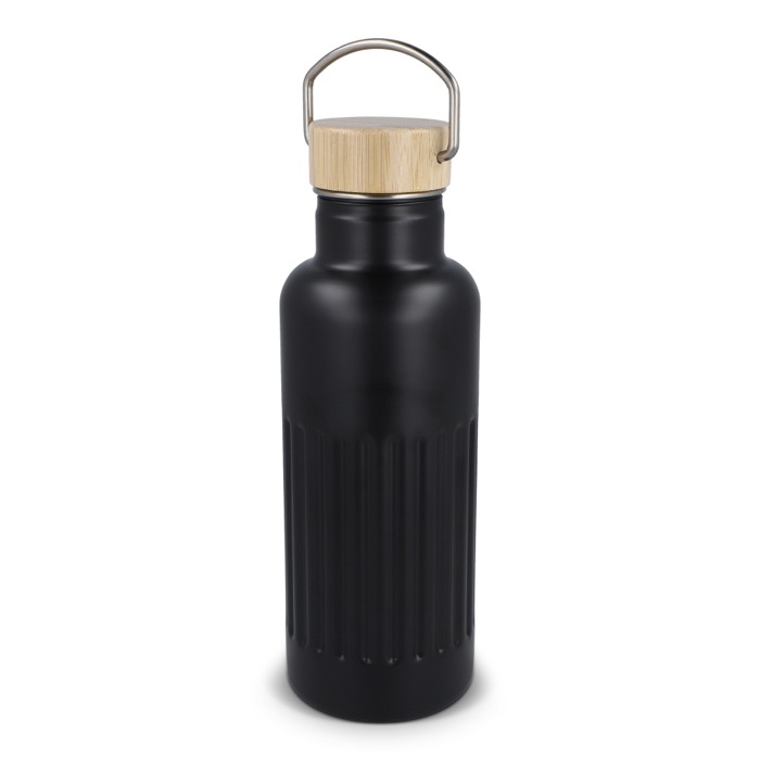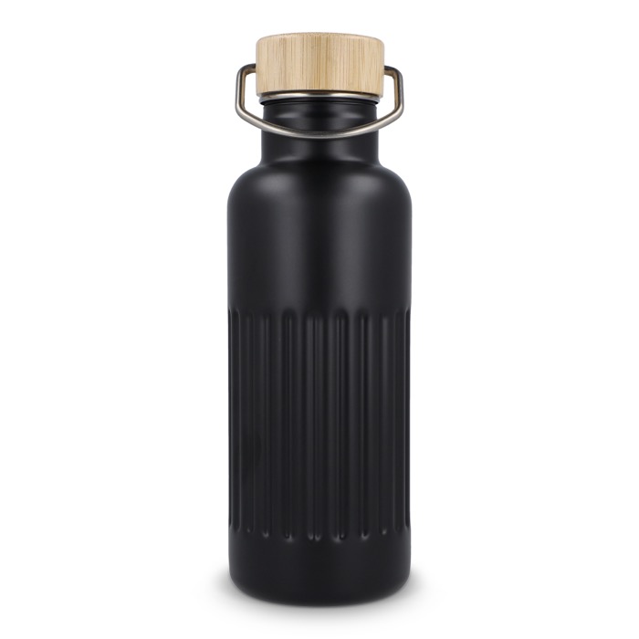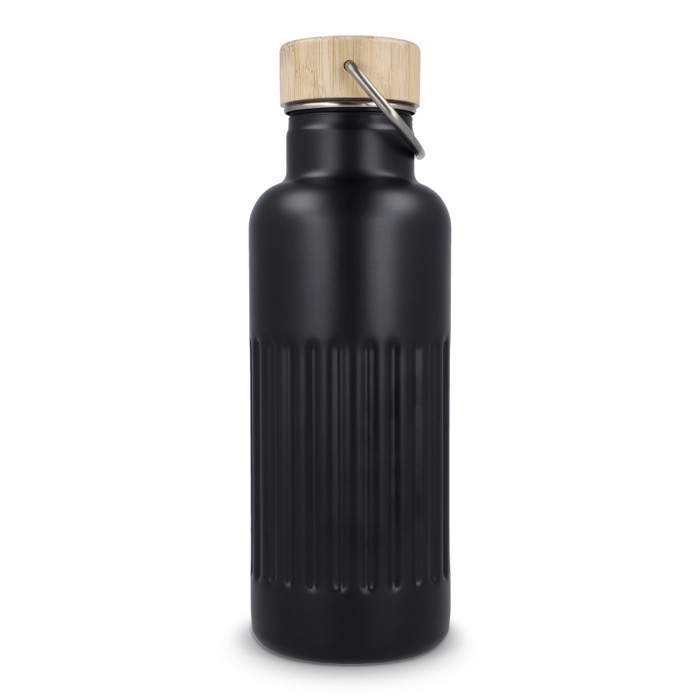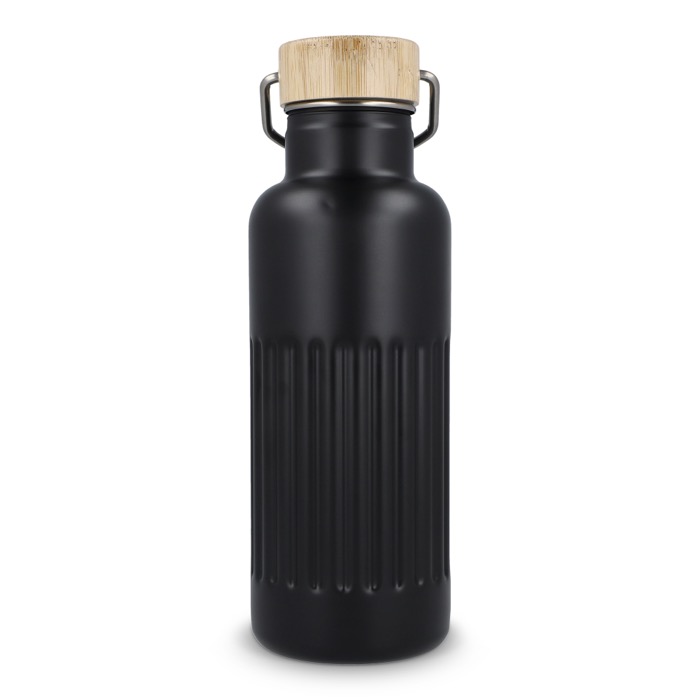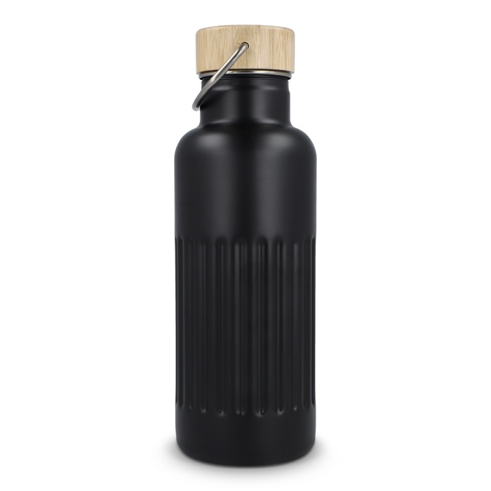 Garrafa térmica de aço inoxidável reciclado com tampa de bambu à prova de fugas e design às riscas no corpo. Mantém as bebidas quentes até 12 horas, conservando cafés, infusões ou água durante o dia de trabalho sem mudanças bruscas de temperatura. A tampa com fecho antigotas facilita o transporte em saco ou mochila sem riscos. Entregue em caixa-oferta, pronta a oferecer. Boa opção para ações de marca no escritório, feiras ou eventos corporativos.