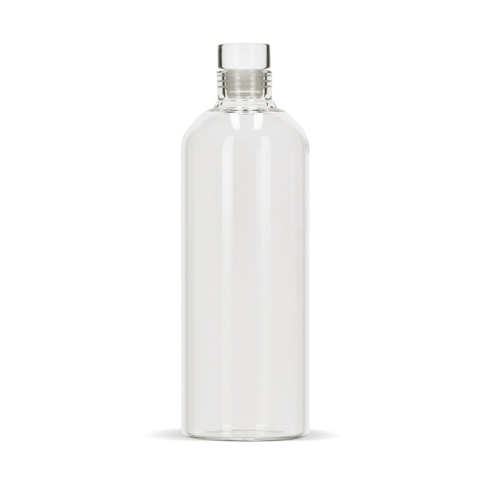 Garrafa de vidro borossilicato com rosca de vidro. Antifugas. Apresentada em caixa tubular. Capacidade: 1 L.