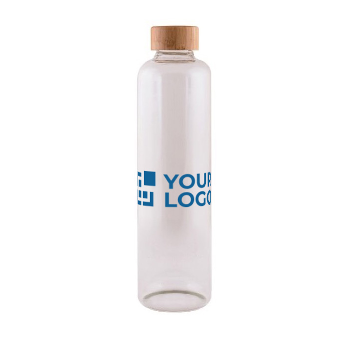 Garrafa promocional de 1 litro feita de vidro de borossilicato de qualidade, com tampa de bambu para um toque eco-friendly e seguro para as bebidas favoritas.