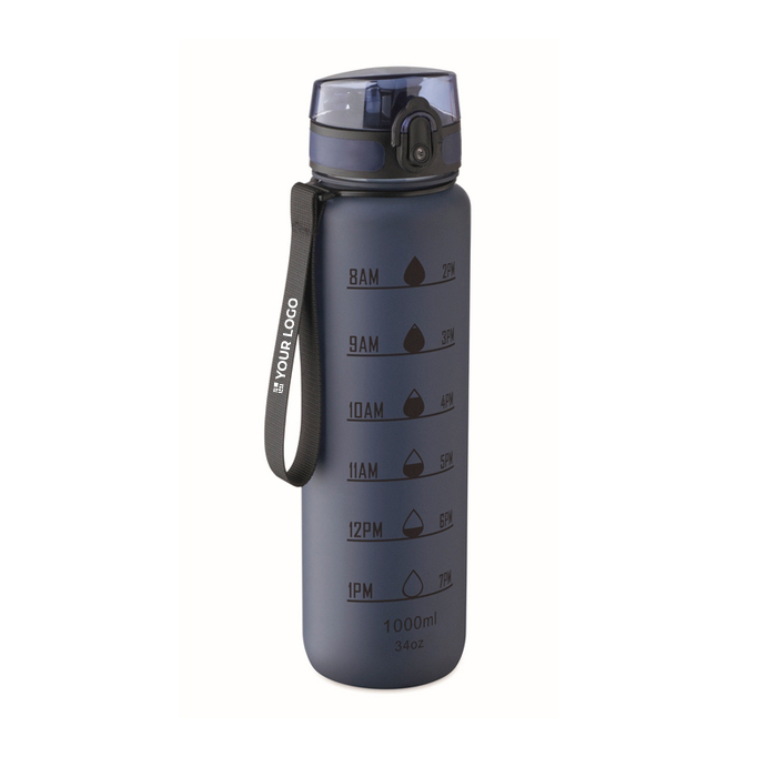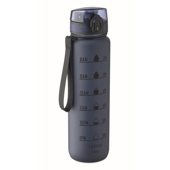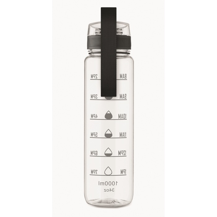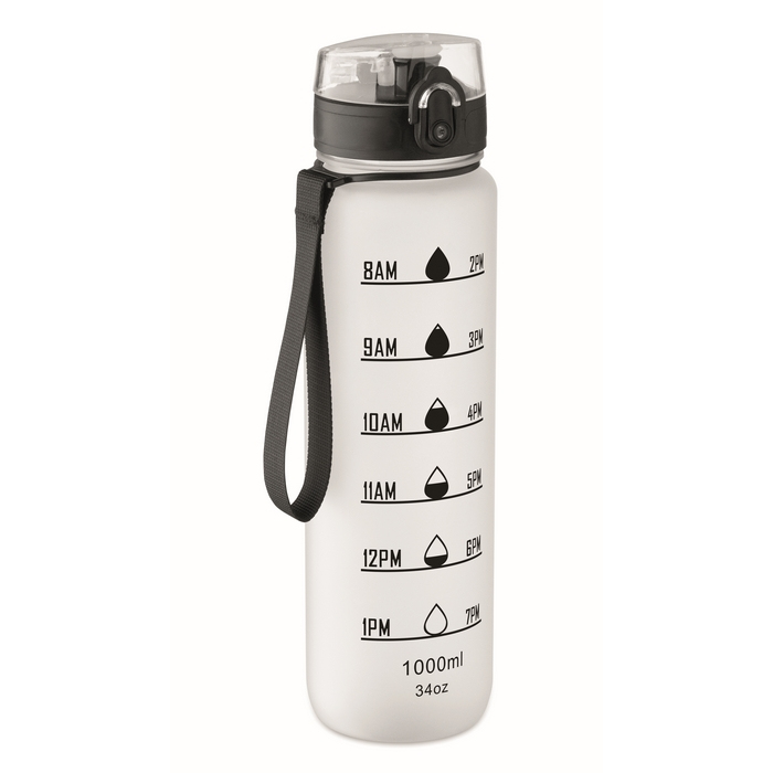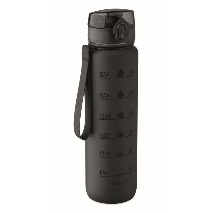 Garrafa de água desportiva de rPET, marcas de tempo motivadoras, tampa rebatível que se abre com uma só mão, fecho de segurança e tira de transporte. Antifugas. Capacidade: 1 L.