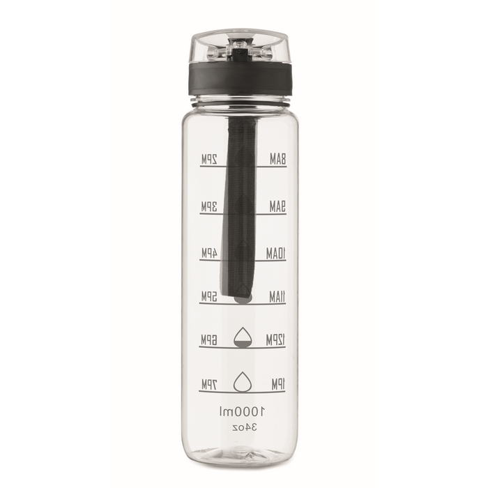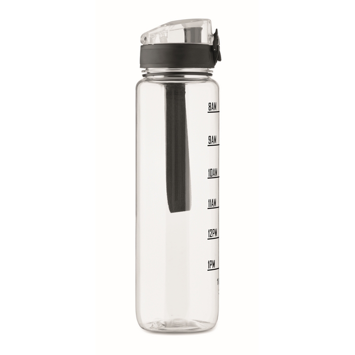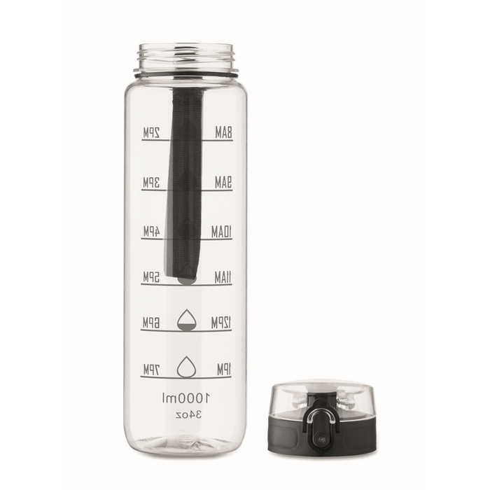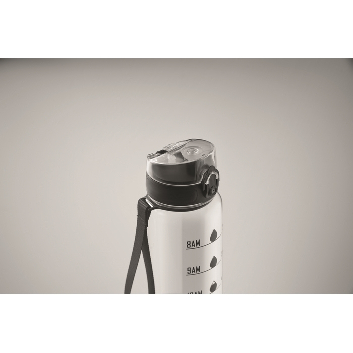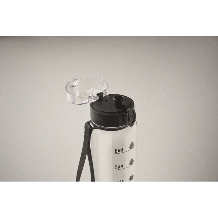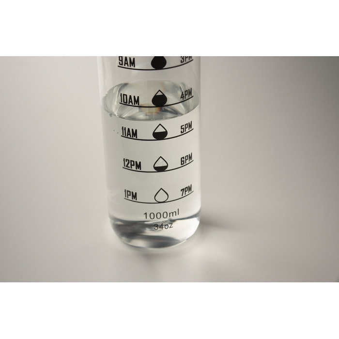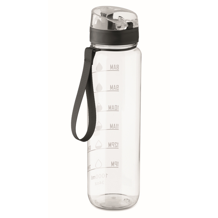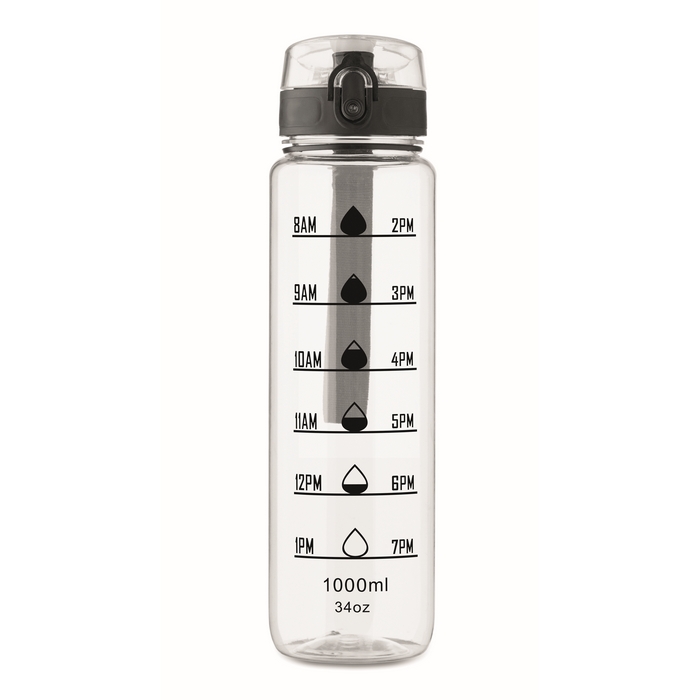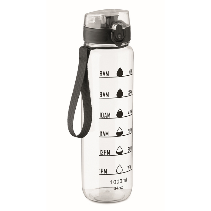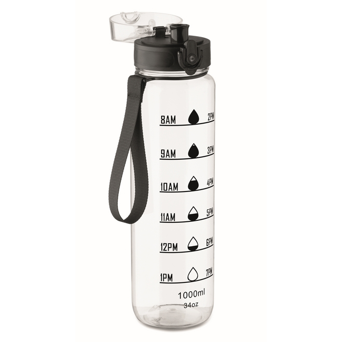Garrafa de plástico com marcas de tempo e tampa rebatível 1 L