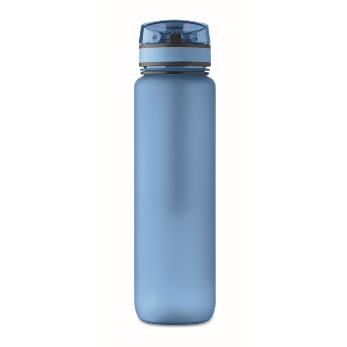 Garrafa desportiva de 1 L: marcas para hidratação, tampa rebatível e fecho antifugas. Recipiente útil que não o deixa esquecer de quando beber durante o dia.